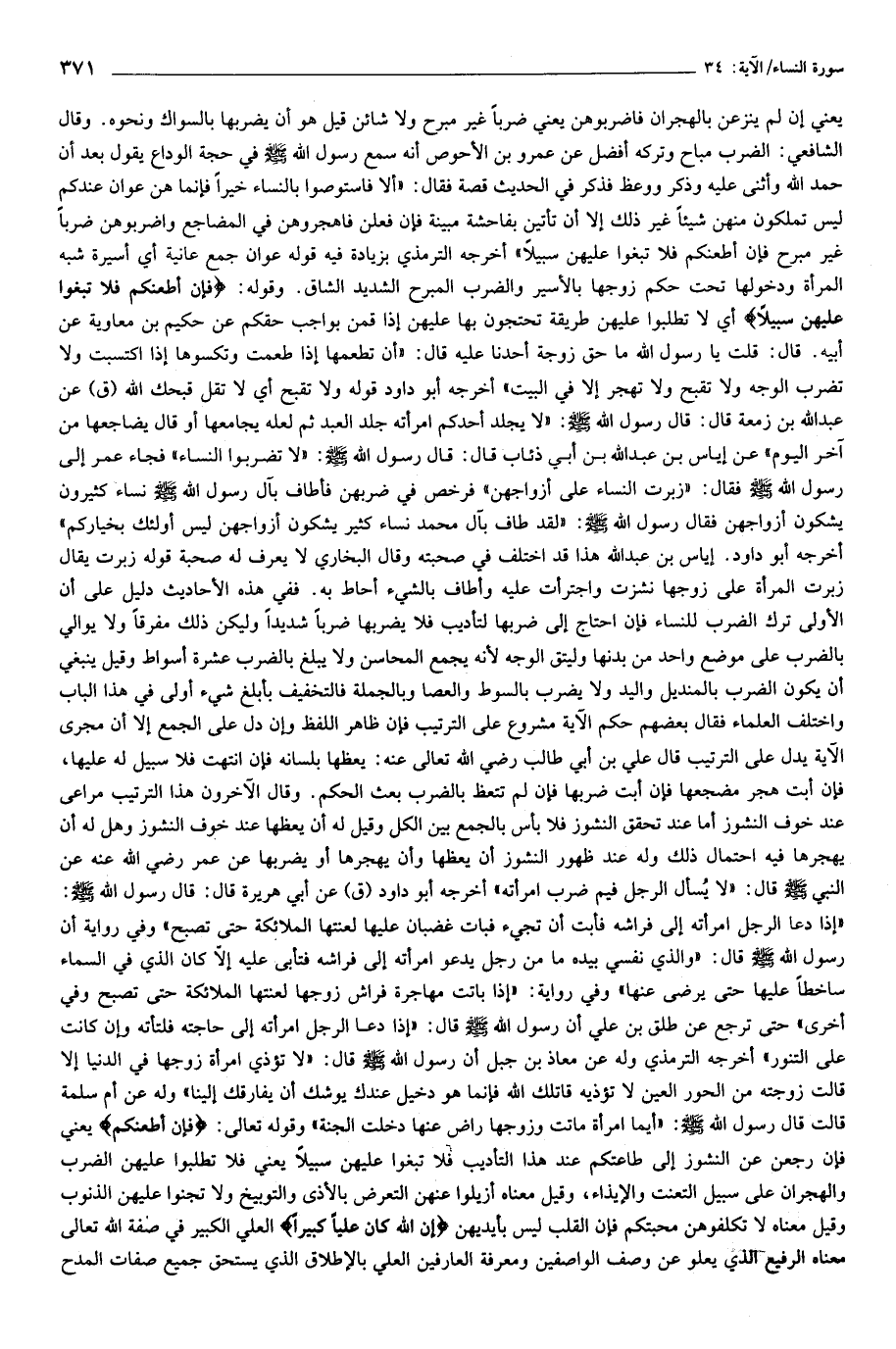 قيل هو أن يضربها بالسواك ونحوه. وقال الشافعي: الضرب مباح وتركه أفضل عن عمرو بن الأحوص أنه سمع رسول الله صلّى الله عليه وسلّم في حجة الوداع يقول بعد أن حمد الله وأثنى عليه وذكر ووعظ فذكر في الحديث قصة فقال: «ألا فاستوصوا بالنساء خيرا فإنما هن عوان عندكم ليس تملكون منهن شيئا غير ذلك إلا أن تأتين بفاحشة مبينة فإن فعلن فاهجروهن في المضاجع واضربوهن ضربا غير مبرح فإن أطعنكم فلا تبغوا عليهن سبيلا» أخرجه الترمذي بزيادة فيه قوله عوان جمع عانية أي أسيرة شبه المرأة ودخولها تحت حكم زوجها بالأسير والضرب المبرح الشديد الشاق. وقوله: فَإِنْ أَطَعْنَكُمْ فَلا تَبْغُوا عَلَيْهِنَّ سَبِيلًا أي لا تطلبوا عليهن طريقة تحتجون بها عليهن إذا قمن بواجب حقكم عن حكيم بن معاوية عن أبيه. قال: قلت يا رسول الله ما حق زوجة أحدنا عليه قال: «أن تطعمها إذا طعمت وتكسوها إذا اكتسبت ولا تضرب الوجه ولا تقبح ولا تهجر إلا في البيت» أخرجه أبو داود قوله ولا تقبح أي لا تقل قبحك الله (ق) عن عبد الله بن زمعة قال: قال رسول الله صلّى الله عليه وسلّم: «لا يجلد أحدكم امرأته جلد العبد ثم لعله يجامعها أو قال يضاجعها من آخر اليوم» عن إياس بن عبد الله بن أبي ذئاب قال: قال رسول الله صلّى الله عليه وسلّم: «لا تضربوا النساء» فجاء عمر إلى رسول الله صلّى الله عليه وسلّم فقال: «زبرت النساء على أزواجهن» فرخص في ضربهن فأطاف بآل رسول الله صلّى الله عليه وسلّم نساء كثيرون يشكون أزواجهن فقال رسول الله صلّى الله عليه وسلّم: «لقد طاف بآل محمد نساء كثير يشكون أزواجهن ليس أولئك بخياركم» أخرجه أبو داود. إياس بن عبد الله هذا قد اختلف في صحبته وقال البخاري لا يعرف له صحبة قوله زبرت يقال زبرت المرأة على زوجها نشزت واجترأت عليه وأطاف بالشيء أحاط به. ففي هذه الأحاديث دليل على أن الأولى ترك الضرب للنساء فإن احتاج إلى ضربها لتأديب فلا يضربها ضربا شديدا وليكن ذلك مفرقا ولا يوالي بالضرب على موضع واحد من بدنها وليتق الوجه لأنه يجمع المحاسن ولا يبلغ بالضرب عشرة أسواط وقيل ينبغي أن يكون الضرب بالمنديل واليد ولا يضرب بالسوط والعصا وبالجملة فالتخفيف بأبلغ شيء أولى في هذا الباب واختلف العلماء فقال بعضهم حكم الآية مشروع على الترتيب فإن ظاهر اللفظ وإن دل على الجمع إلا أن مجرى الآية يدل على الترتيب قال علي بن أبي طالب رضي الله تعالى عنه: يعظها بلسانه فإن انتهت فلا سبيل له عليها، فإن أبت هجر مضجعها فإن أبت ضربها فإن لم تتعظ بالضرب بعث الحكم. وقال الآخرون هذا الترتيب مراعى عند خوف النشوز أما عند تحقق النشوز فلا بأس بالجمع بين الكل وقيل له أن يعظها عند خوف النشوز وهل له أن يهجرها فيه احتمال ذلك وله عند ظهور النشوز أن يعظها وأن يهجرها أو يضربها عن عمر رضي الله عنه عن النبي صلّى الله عليه وسلّم قال: «لا يسأل الرجل فيم ضرب امرأته» أخرجه أبو داود (ق) عن أبي هريرة قال: قال رسول الله صلّى الله عليه وسلّم: