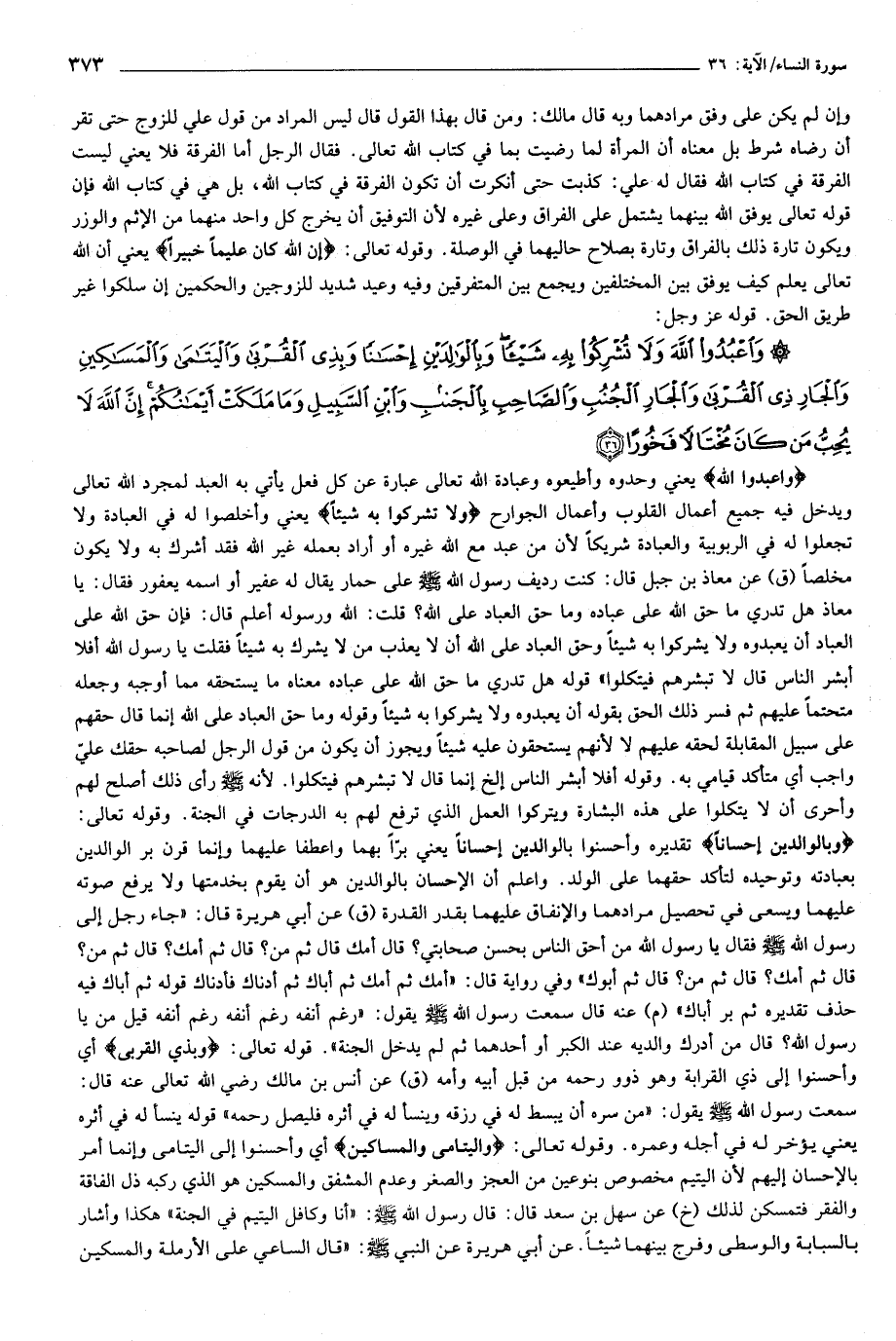 وَاعْبُدُوا اللَّهَ وَلا تُشْرِكُوا بِهِ شَيْئاً وَبِالْوالِدَيْنِ إِحْساناً وَبِذِي الْقُرْبى وَالْيَتامى وَالْمَساكِينِ وَالْجارِ ذِي الْقُرْبى وَالْجارِ الْجُنُبِ وَالصَّاحِبِ بِالْجَنْبِ وَابْنِ السَّبِيلِ وَما مَلَكَتْ أَيْمانُكُمْ إِنَّ اللَّهَ لا يُحِبُّ مَنْ كانَ مُخْتالاً فَخُوراً (36)