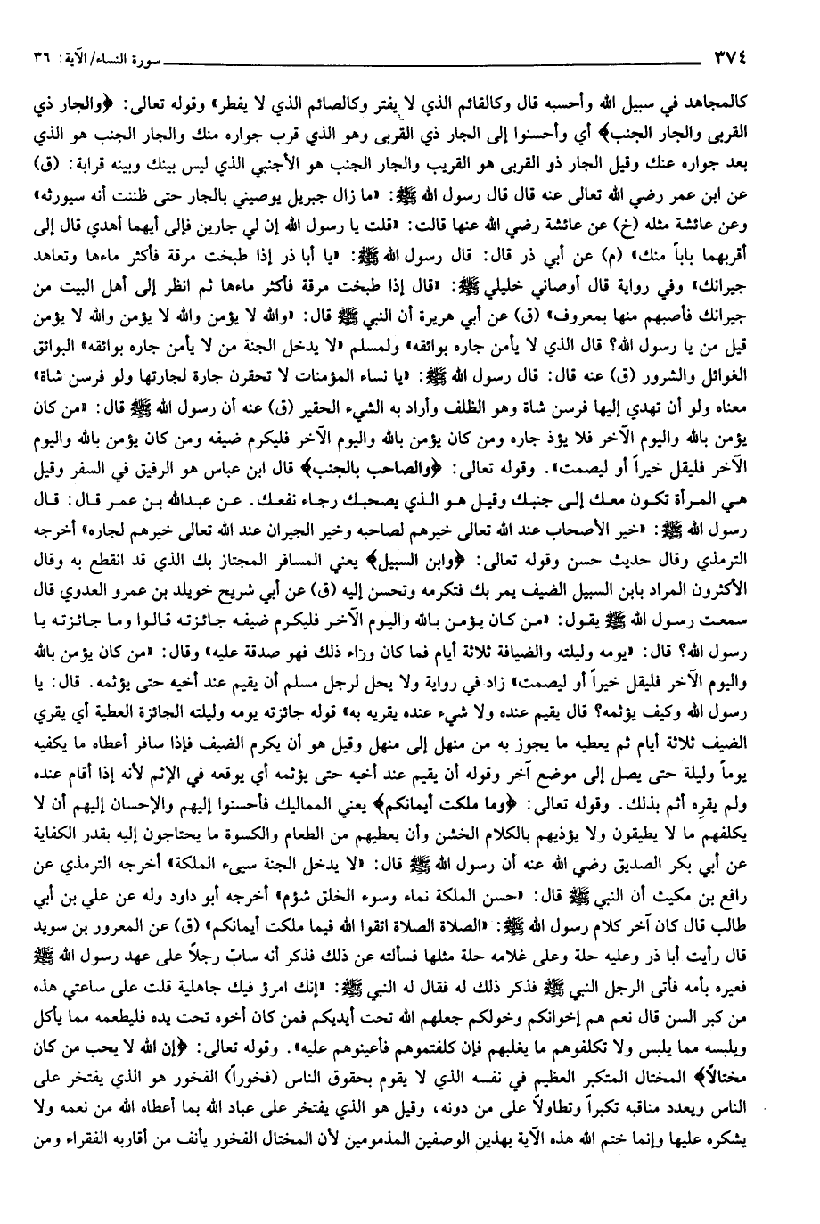 كالمجاهد في سبيل الله وأحسبه قال وكالقائم الذي لا يفتر وكالصائم الذي لا يفطر» وقوله تعالى: وَالْجارِ ذِي الْقُرْبى وَالْجارِ الْجُنُبِ أي وأحسنوا إلى الجار ذي القربى وهو الذي قرب جواره منك والجار الجنب هو الذي بعد جواره عنك وقيل الجار ذو القربى هو القريب والجار الجنب هو الأجنبي الذي ليس بينك وبينه قرابة: (ق) عن ابن عمر رضي الله تعالى عنه قال قال رسول الله صلّى الله عليه وسلّم: «ما زال جبريل يوصيني بالجار حتى ظننت أنه سيورثه» وعن عائشة مثله (خ) عن عائشة رضي الله عنها قالت: «قلت يا رسول الله إن لي جارين فإلى أيهما أهدي قال إلى أقربهما بابا منك» (م) عن أبي ذر قال: قال رسول الله صلّى الله عليه وسلّم: «يا أبا ذر إذا طبخت مرقة فأكثر ماءها وتعاهد جيرانك» وفي رواية قال أوصاني خليلي صلّى الله عليه وسلّم: «قال إذا طبخت مرقة فأكثر ماءها ثم انظر إلى أهل البيت من جيرانك فأصبهم منها بمعروف» (ق) عن أبي هريرة أن النبي صلّى الله عليه وسلّم قال: «والله لا يؤمن والله لا يؤمن والله لا يؤمن قيل من يا رسول الله؟ قال الذي لا يأمن جاره بوائقه» ولمسلم «لا يدخل الجنة من لا يأمن جاره بوائقه» البوائق الغوائل والشرور (ق) عنه قال: قال رسول الله صلّى الله عليه وسلّم: «يا نساء المؤمنات لا تحقرن جارة لجارتها ولو فرسن شاة» معناه ولو أن تهدي إليها فرسن شاة وهو الظلف وأراد به الشيء الحقير (ق) عنه أن رسول الله صلّى الله عليه وسلّم قال: «من كان يؤمن بالله واليوم الآخر فلا يؤذ جاره ومن كان يؤمن بالله واليوم الآخر فليكرم ضيفه ومن كان يؤمن بالله واليوم الآخر فليقل خيرا أو ليصمت». وقوله تعالى: وَالصَّاحِبِ بِالْجَنْبِ قال ابن عباس هو الرفيق في السفر وقيل هي المرأة تكون معك إلى جنبك وقيل هو الذي يصحبك رجاء نفعك. عن عبد الله بن عمر قال: قال رسول الله صلّى الله عليه وسلّم: «خير الأصحاب عند الله تعالى خيرهم لصاحبه وخير الجيران عند الله تعالى خيرهم لجاره» أخرجه الترمذي وقال حديث حسن وقوله تعالى: وَابْنِ السَّبِيلِ يعني المسافر المجتاز بك الذي قد انقطع به وقال الأكثرون المراد بابن السبيل الضيف يمر بك فتكرمه وتحسن إليه (ق) عن أبي شريح خويلد بن عمرو العدوي قال سمعت رسول الله صلّى الله عليه وسلّم يقول: «من كان يؤمن بالله واليوم الآخر فليكرم ضيفه جائزته قالوا وما جائزته يا رسول الله؟ قال: «يومه وليلته والضيافة ثلاثة أيام فما كان وراء ذلك فهو صدقة عليه» وقال: «من كان يؤمن بالله واليوم الآخر فليقل خيرا أو ليصمت» زاد في رواية ولا يحل لرجل مسلم أن يقيم عند أخيه حتى يؤثمه. قال: يا رسول الله وكيف يؤثمه؟ قال يقيم عنده ولا شيء عنده يقريه به» قوله جائزته يومه وليلته الجائزة العطية أي يقري الضيف ثلاثة أيام ثم يعطيه ما يجوز به من منهل إلى منهل وقيل هو أن يكرم الضيف فإذا سافر أعطاه ما يكفيه يوما وليلة حتى يصل إلى موضع آخر وقوله أن يقيم عند أخيه حتى يؤثمه أي يوقعه في الإثم لأنه إذا أقام عنده ولم يقره أثم بذلك. وقوله تعالى: وَما مَلَكَتْ أَيْمانُكُمْ يعني المماليك فأحسنوا إليهم والإحسان إليهم أن لا يكلفهم ما لا يطيقون ولا يؤذيهم بالكلام الخشن وأن يعطيهم من الطعام والكسوة ما يحتاجون إليه بقدر الكفاية
