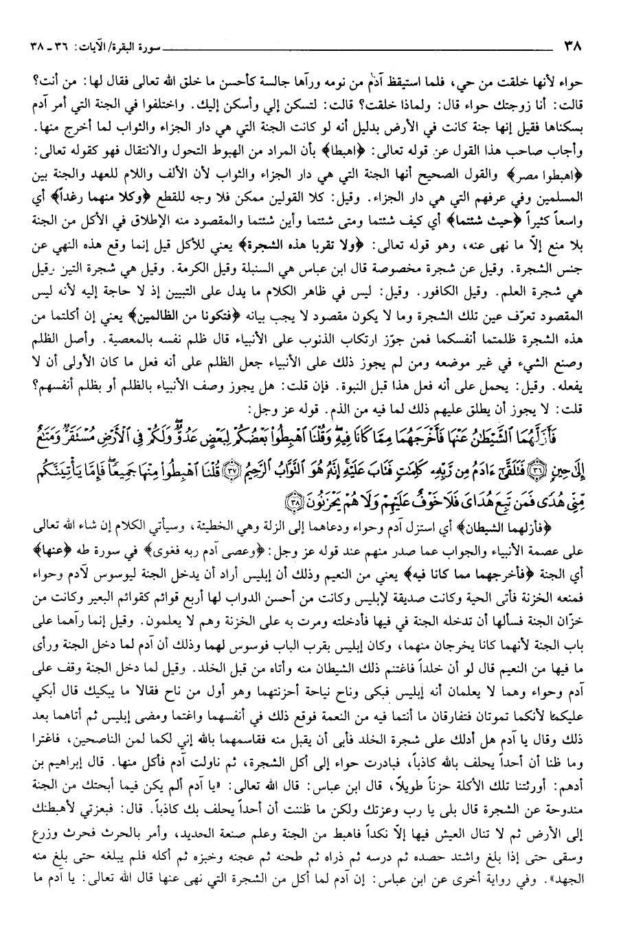 فَأَزَلَّهُمَا الشَّيْطانُ عَنْها فَأَخْرَجَهُما مِمَّا كانا فِيهِ وَقُلْنَا اهْبِطُوا بَعْضُكُمْ لِبَعْضٍ عَدُوٌّ وَلَكُمْ فِي الْأَرْضِ مُسْتَقَرٌّ وَمَتاعٌ إِلى حِينٍ (36) فَتَلَقَّى آدَمُ مِنْ رَبِّهِ كَلِماتٍ فَتابَ عَلَيْهِ إِنَّهُ هُوَ التَّوَّابُ الرَّحِيمُ (37) قُلْنَا اهْبِطُوا مِنْها جَمِيعاً فَإِمَّا يَأْتِيَنَّكُمْ مِنِّي هُدىً فَمَنْ تَبِعَ هُدايَ فَلا خَوْفٌ عَلَيْهِمْ وَلا هُمْ يَحْزَنُونَ (38)