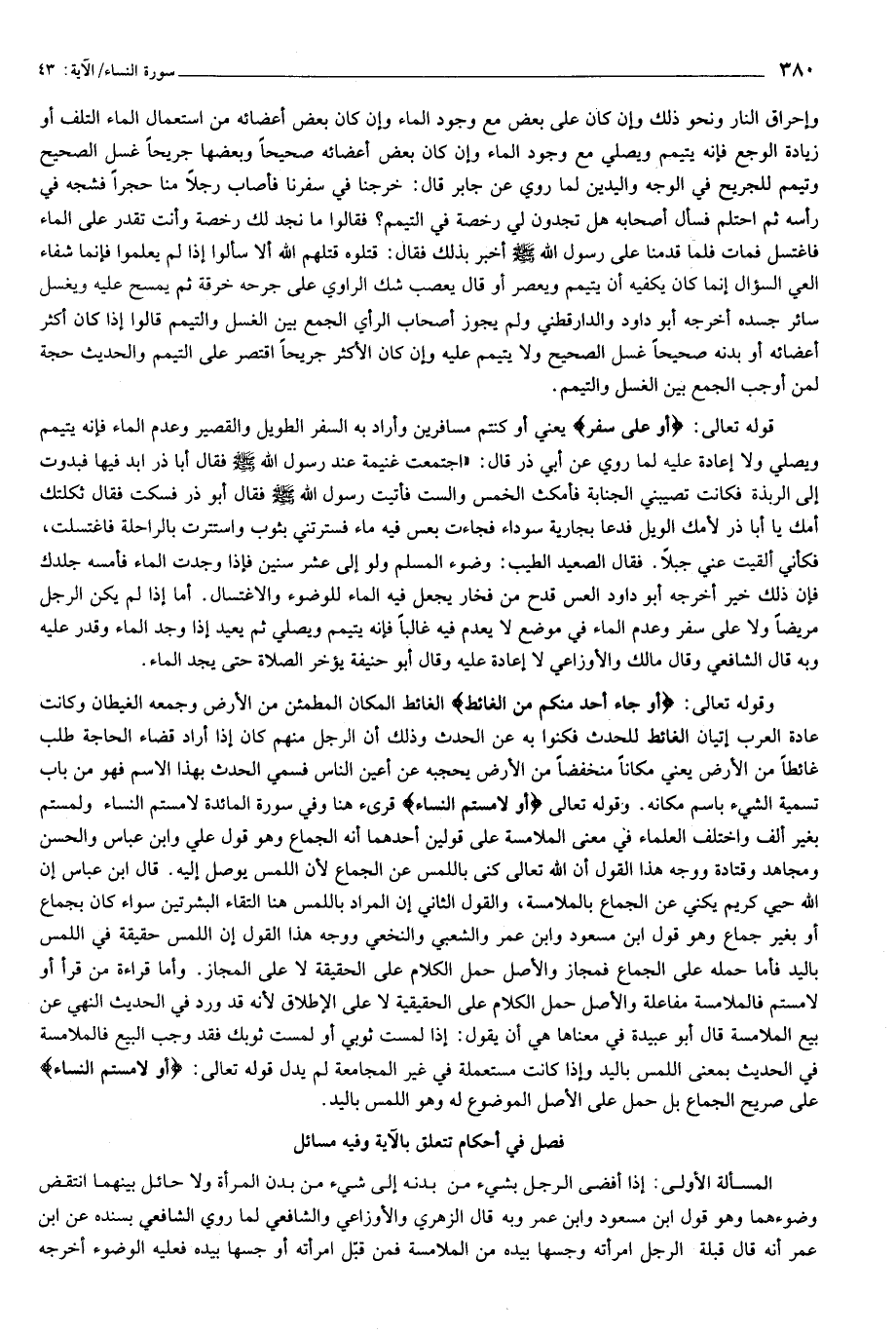 وقوله تعالى: أَوْ جاءَ أَحَدٌ مِنْكُمْ مِنَ الْغائِطِ الغائط المكان المطمئن من الأرض وجمعه الغيطان وكانت عادة العرب إتيان الغائط للحدث فكنوا به عن الحدث وذلك أن الرجل منهم كان إذا أراد قضاء الحاجة طلب غائطا من الأرض يعني مكانا منخفضا من الأرض يحجبه عن أعين الناس فسمي الحدث بهذا الاسم فهو من باب تسمية الشيء باسم مكانه. وقوله تعالى أَوْ لامَسْتُمُ النِّساءَ قرئ هنا وفي سورة المائدة لامستم النساء ولمستم بغير ألف واختلف العلماء في معنى الملامسة على قولين أحدهما أنه الجماع وهو قول علي وابن عباس والحسن ومجاهد وقتادة ووجه هذا القول أن الله تعالى كنى باللمس عن الجماع لأن اللمس يوصل إليه. قال ابن عباس إن الله حيي كريم يكني عن الجماع بالملامسة، والقول الثاني إن المراد باللمس هنا التقاء البشرتين سواء كان بجماع أو بغير جماع وهو قول ابن مسعود وابن عمر والشعبي والنخعي ووجه هذا القول إن اللمس حقيقة في اللمس باليد فأما حمله على الجماع فمجاز والأصل حمل الكلام على الحقيقة لا على المجاز. وأما قراءة من قرأ أو لامستم فالملامسة مفاعلة والأصل حمل الكلام على الحقيقية لا على الإطلاق لأنه قد ورد في الحديث النهي عن بيع الملامسة قال أبو عبيدة في معناها هي أن يقول: إذا لمست ثوبي أو لمست ثوبك فقد وجب البيع فالملامسة في الحديث بمعنى اللمس باليد وإذا كانت مستعملة في غير المجامعة لم يدل قوله تعالى: أَوْ لامَسْتُمُ النِّساءَ على صريح الجماع بل حمل على الأصل الموضوع له وهو اللمس باليد.