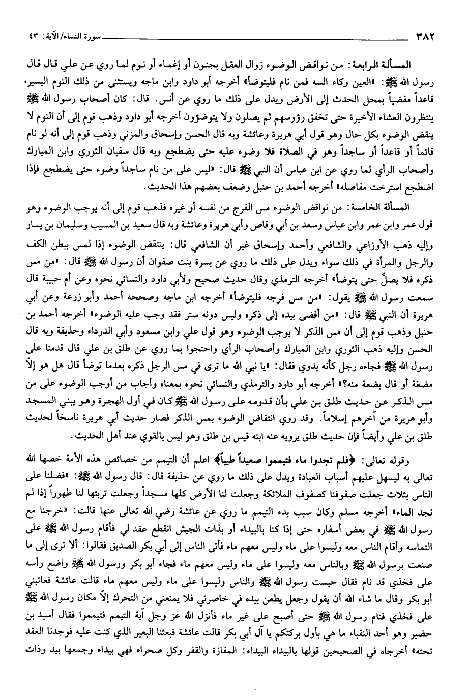 المسألة الرابعة: من نواقض الوضوء زوال العقل بجنون أو إغماء أو نوم لما روي عن علي قال قال رسول الله صلّى الله عليه وسلّم: «العين وكاء السه فمن نام فليتوضأ» أخرجه أبو داود وابن ماجة ويستثنى من ذلك النوم اليسير، قاعدا مفضيا بمحل الحدث إلى الأرض ويدل على ذلك ما روي عن أنس. قال: كان أصحاب رسول الله صلّى الله عليه وسلّم ينتظرون العشاء الأخيرة حتى تخفق رؤوسهم ثم يصلون ولا يتوضؤون أخرجه أبو داود وذهب قوم إلى أن النوم لا ينقض الوضوء بكل حال وهو قول أبي هريرة وعائشة وبه قال الحسن وإسحاق والمزني وذهب قوم إلى أنه لو نام قائما أو قاعدا أو ساجدا وهو في الصلاة فلا وضوء عليه حتى يضطجع وبه قال سفيان الثوري وابن المبارك وأصحاب الرأي لما روي عن ابن عباس أن النبي صلّى الله عليه وسلّم قال: «ليس على من نام ساجدا وضوء حتى يضطجع فإذا اضطجع استرخت مفاصله» أخرجه أحمد بن حنبل وضعف بعضهم هذا الحديث.
