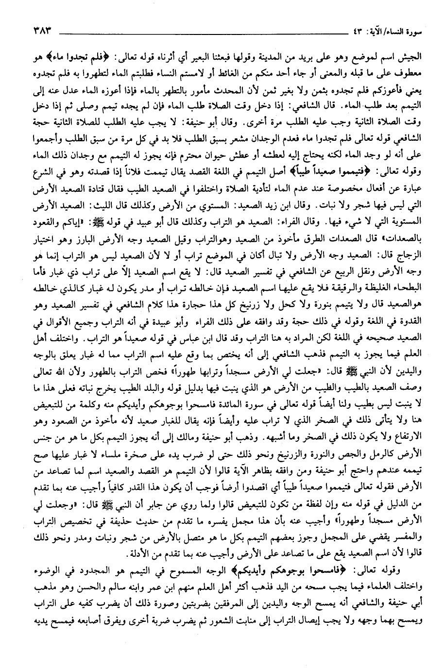 الجيش اسم لموضع وهو على بريد من المدينة وقولها فبعثنا البعير أي أثرناه قوله تعالى: فَلَمْ تَجِدُوا ماءً هو معطوف على ما قبله والمعنى أو جاء أحد منكم من الغائط أو لامستم النساء فطلبتم الماء لتطهروا به فلم تجدوه يعني فأعوزكم فلم تجدوه بثمن ولا بغير ثمن لأن المحدث مأمور بالتطهر بالماء فإذا أعوزه الماء عدل عنه إلى التيمم بعد طلب الماء. قال الشافعي: إذا دخل وقت الصلاة طلب الماء فإن لم يجده تيمم وصلى ثم إذا دخل وقت الصلاة الثانية وجب عليه الطلب مرة أخرى. وقال أبو حنيفة: لا يجب عليه الطلب للصلاة الثانية حجة الشافعي قوله تعالى فلم تجدوا ماء فعدم الوجدان مشعر بسبق الطلب فلا بد في كل مرة من سبق الطلب وأجمعوا على أنه لو وجد الماء لكنه يحتاج إليه لعطشه أو عطش حيوان محترم فإنه يجوز له التيمم مع وجدان ذلك الماء وقوله تعالى: فَتَيَمَّمُوا صَعِيداً طَيِّباً أصل التيمم في اللغة القصد يقال تيممت فلانا إذا قصدته وهو في الشرع عبارة عن أفعال مخصوصة عند عدم الماء لتأدية الصلاة واختلفوا في الصعيد الطيب فقال قتادة الصعيد الأرض التي ليس فيها شجر ولا نبات. وقال ابن زيد الصعيد: المستوي من الأرض وكذلك قال الليث: الصعيد الأرض المستوية التي لا شيء فيها. وقال الفراء: الصعيد هو التراب وكذلك قال أبو عبيد في قوله صلّى الله عليه وسلّم: «إياكم والقعود بالصعدات» قال الصعدات الطرق مأخوذ من الصعيد وهو التراب وقيل الصعيد وجه الأرض البارز وهو اختيار الزجاج قال: الصعيد وجه الأرض ولا تبال أكان في الموضع تراب أو لا لأن الصعيد ليس هو التراب إنما هو وجه الأرض ونقل الربيع عن الشافعي في تفسير الصعيد قال: لا يقع اسم الصعيد إلّا على تراب ذي غبار فأما البطحاء الغليظة والرقيقة فلا يقع عليها اسم الصعيد فإن خالطه تراب أو مدر يكون له غبار كالذي خالطه هو الصعيد قال ولا يتيمم بنورة ولا كحل ولا زرنيخ كل هذا حجارة هذا كلام الشافعي في تفسير الصعيد وهو القدوة في اللغة وقوله في ذلك حجة وقد وافقه على ذلك الفراء وأبو عبيدة في أنه التراب وجميع الأقوال في الصعيد صحيحه في اللغة لكن المراد به هنا التراب وقد قال ابن عباس في قوله صعيدا هو التراب. واختلف أهل العلم فيما يجوز به التيمم فذهب الشافعي إلى أنه يختص بما وقع عليه اسم التراب مما له غبار يعلق بالوجه واليدين لأن النبي صلّى الله عليه وسلّم قال: «جعلت
