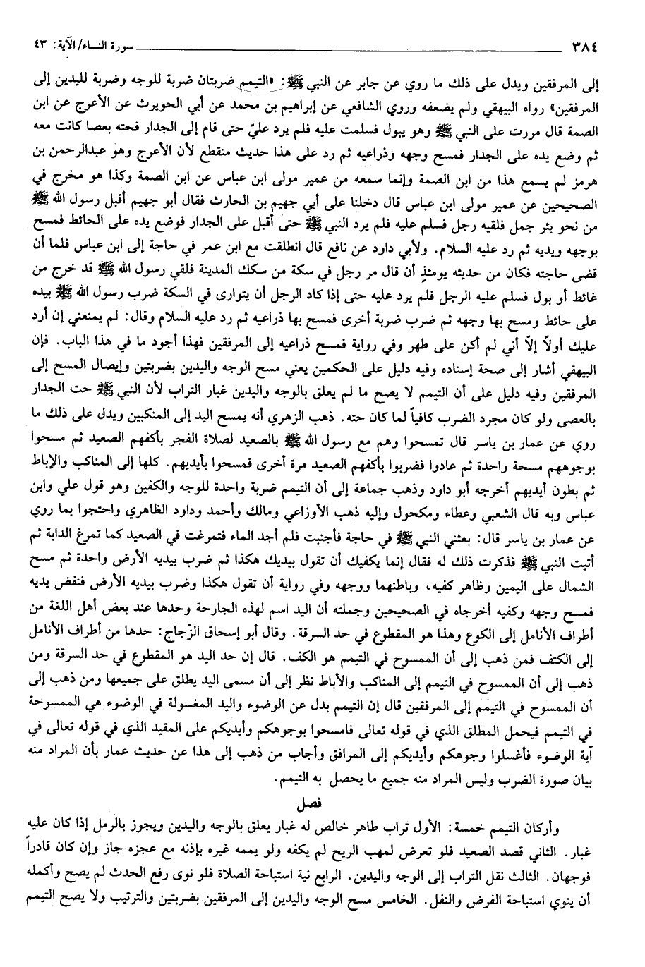إلى المرفقين ويدل على ذلك ما روي عن جابر عن النبي صلّى الله عليه وسلّم: «التيمم ضربتان ضربة للوجه وضربة لليدين إلى المرفقين» رواه البيهقي ولم يضعفه وروي الشافعي عن إبراهيم بن محمد عن أبي الحويرث عن الأعرج عن ابن الصمة قال مررت على النبي صلّى الله عليه وسلّم وهو يبول فسلمت عليه فلم يرد عليّ حتى قام إلى الجدار فحته بعصا كانت معه ثم وضع يده على الجدار فمسح وجهه وذراعيه ثم رد على هذا حديث منقطع لأن الأعرج وهو عبد الرحمن بن هرمز لم يسمع هذا من ابن الصمة وإنما سمعه من عمير مولى ابن عباس عن ابن الصمة وكذا هو مخرج في الصحيحين عن عمير مولى ابن عباس قال دخلنا على أبي جهيم بن الحارث فقال أبو جهيم أقبل رسول الله صلّى الله عليه وسلّم من نحو بئر جمل فلقيه رجل فسلم عليه فلم يرد النبي صلّى الله عليه وسلّم حتى أقبل على الجدار فوضع يده على الحائط فمسح بوجهه ويديه ثم رد عليه السلام. ولأبي داود عن نافع قال انطلقت مع ابن عمر في حاجة إلى ابن عباس فلما أن قضى حاجته فكان من حديثه يومئذ أن قال مر رجل في سكة من سكك المدينة فلقي رسول الله صلّى الله عليه وسلّم قد خرج من غائط أو بول فسلم عليه الرجل فلم يرد عليه حتى إذا كاد الرجل أن يتوارى في السكة ضرب رسول الله صلّى الله عليه وسلّم بيده على حائط ومسح بها وجهه ثم ضرب ضربة أخرى فمسح بها ذراعيه ثم رد عليه السلام وقال: لم يمنعني إن أرد عليك أولا إلّا أني لم أكن على طهر وفي رواية فمسح ذراعيه إلى المرفقين فهذا أجود ما في هذا الباب. فإن البيهقي أشار إلى صحة إسناده وفيه دليل على الحكمين يعني مسح الوجه واليدين بضربتين وإيصال المسح إلى المرفقين وفيه دليل على أن التيمم لا يصح ما لم يعلق بالوجه واليدين غبار التراب لأن النبي صلّى الله عليه وسلّم حت الجدار بالعصى ولو كان مجرد الضرب كافيا لما كان حته. ذهب الزهري أنه يمسح اليد إلى المنكبين ويدل على ذلك ما روي عن عمار بن ياسر قال تمسحوا وهم مع رسول الله صلّى الله عليه وسلّم بالصعيد لصلاة الفجر بأكفهم الصعيد ثم مسحوا بوجوههم مسحة واحدة ثم عادوا فضربوا بأكفهم الصعيد مرة أخرى فمسحوا بأيديهم. كلها إلى المناكب والآباط ثم بطون أيديهم أخرجه أبو داود وذهب جماعة إلى أن التيمم ضربة واحدة للوجه والكفين وهو قول علي وابن عباس وبه قال الشعبي وعطاء ومكحول وإليه ذهب الأوزاعي ومالك وأحمد وداود الظاهري واحتجوا بما روي عن عمار بن ياسر قال: بعثني النبي صلّى الله عليه وسلّم في حاجة فأجنبت فلم أجد الماء فتمرغت في الصعيد كما تمرغ الدابة ثم أتيت النبي صلّى الله عليه وسلّم فذكرت ذلك له فقال إنما يكفيك أن تقول بيديك هكذا ثم ضرب بيديه الأرض واحدة ثم مسح الشمال على اليمين وظاهر كفيه، وباطنهما ووجهه وفي رواية أن تقول هكذا وضرب بيديه الأرض فنفض يديه فمسح وجهه وكفيه أخرجاه في الصحيحين وجملته أن اليد اسم لهذه الجارحة وحدها عند بعض أهل اللغة من أطراف الأنامل إلى الكوع وهذا هو المقطوع في حد السرقة. وقال أبو إسحاق الزّجاج: حدها من أطراف الأنامل إلى الكتف فمن ذهب إلى أن الممسوح في التيمم هو الكف. قال إن حد اليد هو المقطوع في حد السرقة ومن ذهب إلى أن الممسوح في التيمم إلى المناكب والآباط نظر إلى أن مسمى اليد يطلق على جميعها ومن ذهب إلى أن الممسوح في التيمم إلى المرفقين قال إن التيمم بدل عن الوضوء واليد المغسولة في الوضوء هي الممسوحة في التيمم فيحمل المطلق الذي