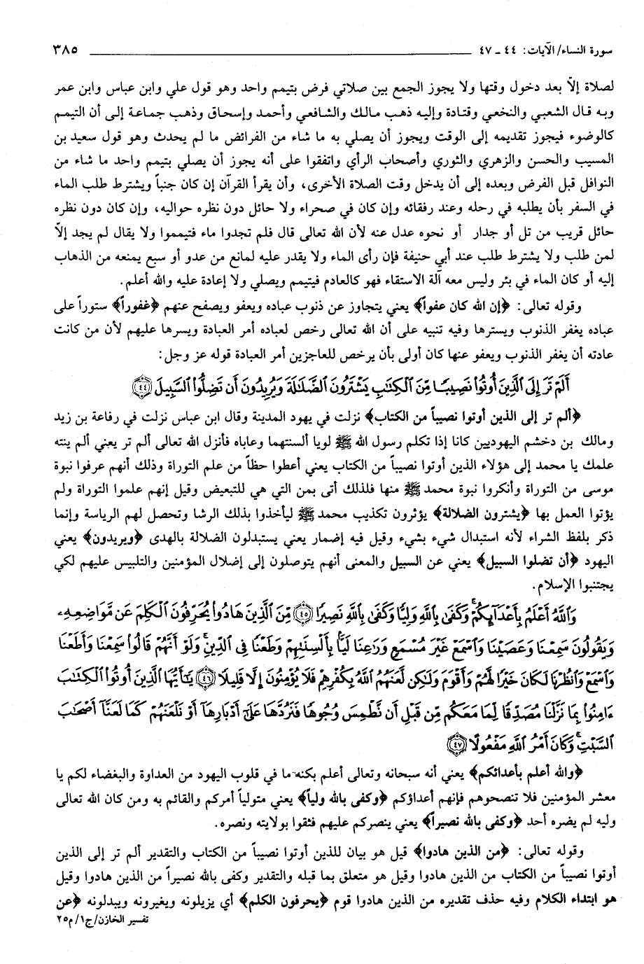 وَاللَّهُ أَعْلَمُ بِأَعْدائِكُمْ وَكَفى بِاللَّهِ وَلِيًّا وَكَفى بِاللَّهِ نَصِيراً (45) مِنَ الَّذِينَ هادُوا يُحَرِّفُونَ الْكَلِمَ عَنْ مَواضِعِهِ وَيَقُولُونَ سَمِعْنا وَعَصَيْنا وَاسْمَعْ غَيْرَ مُسْمَعٍ وَراعِنا لَيًّا بِأَلْسِنَتِهِمْ وَطَعْناً فِي الدِّينِ وَلَوْ أَنَّهُمْ قالُوا سَمِعْنا وَأَطَعْنا وَاسْمَعْ وَانْظُرْنا لَكانَ خَيْراً لَهُمْ وَأَقْوَمَ وَلكِنْ لَعَنَهُمُ اللَّهُ بِكُفْرِهِمْ فَلا يُؤْمِنُونَ إِلاَّ قَلِيلاً (46) يا أَيُّهَا الَّذِينَ أُوتُوا الْكِتابَ آمِنُوا بِما نَزَّلْنا مُصَدِّقاً لِما مَعَكُمْ مِنْ قَبْلِ أَنْ نَطْمِسَ وُجُوهاً فَنَرُدَّها عَلى أَدْبارِها أَوْ نَلْعَنَهُمْ كَما لَعَنَّا أَصْحابَ السَّبْتِ وَكانَ أَمْرُ اللَّهِ مَفْعُولاً (47)