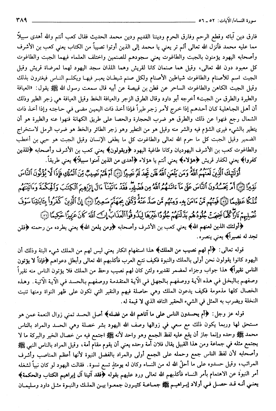 أُولئِكَ الَّذِينَ لَعَنَهُمُ اللَّهُ وَمَنْ يَلْعَنِ اللَّهُ فَلَنْ تَجِدَ لَهُ نَصِيراً (52) أَمْ لَهُمْ نَصِيبٌ مِنَ الْمُلْكِ فَإِذاً لا يُؤْتُونَ النَّاسَ نَقِيراً (53) أَمْ يَحْسُدُونَ النَّاسَ عَلى ما آتاهُمُ اللَّهُ مِنْ فَضْلِهِ فَقَدْ آتَيْنا آلَ إِبْراهِيمَ الْكِتابَ وَالْحِكْمَةَ وَآتَيْناهُمْ مُلْكاً عَظِيماً (54) فَمِنْهُمْ مَنْ آمَنَ بِهِ وَمِنْهُمْ مَنْ صَدَّ عَنْهُ وَكَفى بِجَهَنَّمَ سَعِيراً (55) إِنَّ الَّذِينَ كَفَرُوا بِآياتِنا سَوْفَ نُصْلِيهِمْ ناراً كُلَّما نَضِجَتْ جُلُودُهُمْ بَدَّلْناهُمْ جُلُوداً غَيْرَها لِيَذُوقُوا الْعَذابَ إِنَّ اللَّهَ كانَ عَزِيزاً حَكِيماً (56)