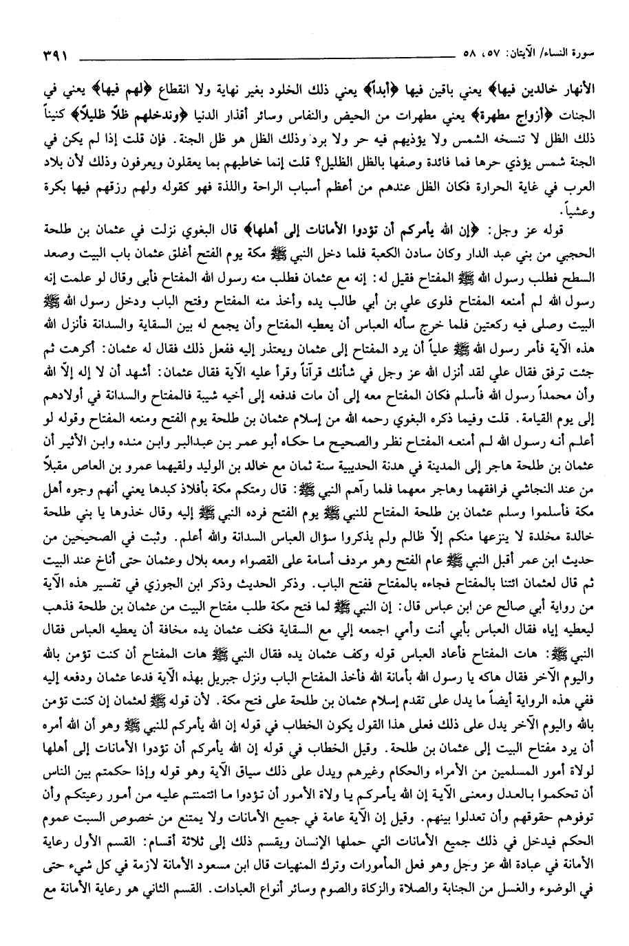 قوله عز وجل: إِنَّ اللَّهَ يَأْمُرُكُمْ أَنْ تُؤَدُّوا الْأَماناتِ إِلى أَهْلِها قال البغوي نزلت في عثمان بن طلحة الحجبي من بني عبد الدار وكان سادن الكعبة فلما دخل النبي صلّى الله عليه وسلّم مكة يوم الفتح أغلق عثمان باب البيت وصعد السطح فطلب رسول الله صلّى الله عليه وسلّم المفتاح فقيل له: إنه مع عثمان فطلب منه رسول الله المفتاح فأبى وقال لو علمت إنه رسول الله لم أمنعه المفتاح فلوى علي بن أبي طالب يده وأخذ منه المفتاح وفتح الباب ودخل رسول الله صلّى الله عليه وسلّم البيت وصلى فيه ركعتين فلما خرج سأله العباس أن يعطيه المفتاح وأن يجمع له بين السقاية والسدانة فأنزل الله هذه الآية فأمر رسول الله صلّى الله عليه وسلّم عليا أن يرد المفتاح إلى عثمان ويعتذر إليه ففعل ذلك فقال له عثمان: أكرهت ثم جئت ترفق فقال علي لقد أنزل الله عز وجل في شأنك قرآنا وقرأ عليه الآية فقال عثمان: أشهد أن لا إله إلّا الله وأن محمدا رسول الله فأسلم فكان المفتاح معه إلى أن مات فدفعه إلى أخيه شيبة فالمفتاح والسدانة في أولادهم إلى يوم القيامة. قلت وفيما ذكره البغوي رحمه الله من إسلام عثمان بن طلحة يوم الفتح ومنعه المفتاح وقوله لو أعلم أنه رسول الله لم أمنعه المفتاح نظر والصحيح ما حكاه أبو عمر بن عبد البر وابن مندة وابن الأثير أن عثمان بن طلحة هاجر إلى المدينة في هدنة الحديبية سنة ثمان مع خالد بن الوليد ولقيهما عمرو بن العاص مقبلا من عند النجاشي فرافقهما وهاجر معهما فلما رآهم النبي صلّى الله عليه وسلّم: قال رمتكم مكة بأفلاذ كبدها يعني أنهم وجوه أهل مكة فأسلموا وسلم عثمان بن طلحة المفتاح للنبي صلّى الله عليه وسلّم يوم الفتح فرده النبي صلّى الله عليه وسلّم إليه وقال خذوها يا بني طلحة خالدة مخلدة لا ينزعها منكم إلّا ظالم ولم يذكروا سؤال العباس السدانة والله أعلم. وثبت في الصحيحين من حديث ابن عمر أقبل النبي صلّى الله عليه وسلّم عام الفتح وهو مردف أسامة على القصواء ومعه بلال وعثمان حتى أناخ عند البيت ثم قال لعثمان ائتنا بالمفتاح فجاءه بالمفتاح ففتح الباب. وذكر الحديث وذكر ابن الجوزي في تفسير هذه الآية من رواية أبي صالح عن ابن عباس قال: إن النبي صلّى الله عليه وسلّم لما فتح مكة طلب مفتاح البيت من عثمان بن طلحة فذهب ليعطيه إياه فقال العباس بأبي أنت وأمي اجمعه إلي مع السقاية فكف عثمان يده مخافة أن يعطيه العباس فقال النبي صلّى الله عليه وسلّم: هات المفتاح فأعاد العباس قوله وكف عثمان يده فقال النبي صلّى الله عليه وسلّم هات المفتاح أن كنت تؤمن بالله واليوم الآخر فقال هاكه يا رسول الله بأمانة الله فأخذ المفتاح الباب ونزل جبريل بهذه الآية فدعا عثمان ودفعه إليه ففي هذه الرواية أيضا ما يدل على تقدم إسلام عثمان بن طلحة على فتح مكة. لأن قوله صلّى الله عليه وسلّم لعثمان إن كنت تؤمن بالله واليوم الآخر يدل على ذلك فعلى هذا القول يكون الخطاب في قوله إن الله يأمركم للنبي صلّى الله عليه وسلّم وهو أن الله أمره أن يرد مفتاح البيت إلى عثمان بن طلحة. وقيل الخطاب في قوله إن الله يأمركم أن تؤدوا الأمانات إلى أهلها لولاة أمور المسلمين من الأمراء والحكام وغيرهم ويدل على ذلك سياق الآية وهو قوله وإذا حكمتم بين الناس أن تحكموا بالعدل ومعنى الآية إن الله يأمركم يا ولاة الأمور أن تؤدوا ما ائتمنتم عليه من أمور رعيتكم وأن توفوهم حقوقهم وأن تعدلوا بينهم. وقيل إن الآية عامة في جميع الأمانات ولا يمتنع من خصوص السبت عموم الحكم فيدخل في ذلك جميع الأمانات التي حملها الإنسان ويقسم ذلك إلى ثلاثة أقسام: القسم الأول رعاية الأمانة في عبادة الله عز وجل وهو فعل المأمورات وترك المنهيات قال ابن مسعود الأمانة لازمة في كل شيء حتى في الوضوء والغسل من الجنابة والصلاة والزكاة والصوم وسائر أنواع العبادات. القسم الثاني هو رعاية الأمانة مع