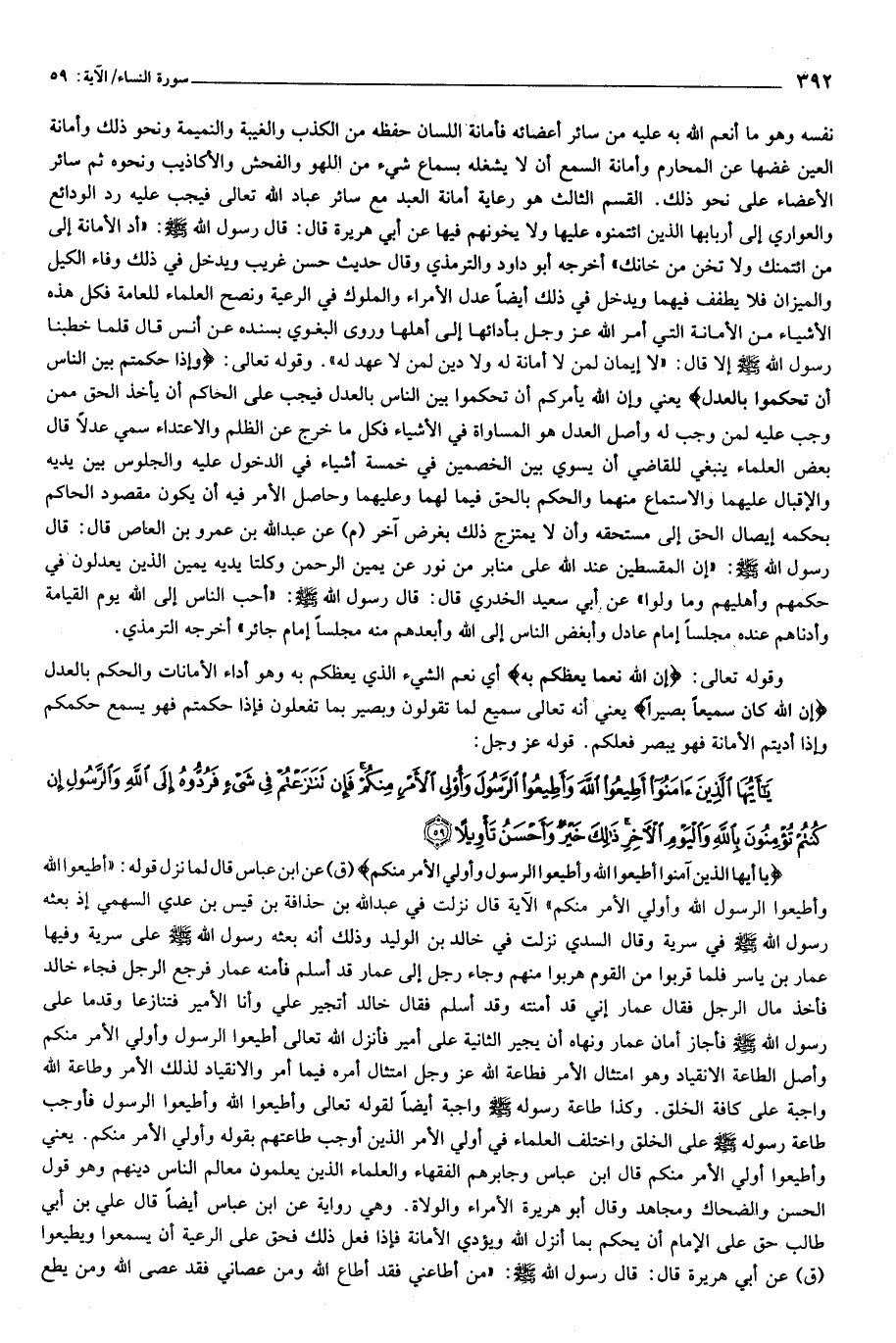 يا أَيُّهَا الَّذِينَ آمَنُوا أَطِيعُوا اللَّهَ وَأَطِيعُوا الرَّسُولَ وَأُولِي الْأَمْرِ مِنْكُمْ (ق) عن ابن عباس قال لما نزل قوله: «أطيعوا الله وأطيعوا الرسول الله وأولي الأمر منكم» الآية قال نزلت في عبد الله بن حذافة بن قيس بن عدي السهمي إذ بعثه رسول الله صلّى الله عليه وسلّم في سرية وقال السدي نزلت في خالد بن الوليد وذلك أنه بعثه رسول الله صلّى الله عليه وسلّم على سرية وفيها عمار بن ياسر فلما قربوا من القوم هربوا منهم وجاء رجل إلى عمار قد أسلم فأمنه عمار فرجع الرجل فجاء خالد فأخذ مال الرجل فقال عمار إني قد أمنته وقد أسلم فقال خالد أتجير علي وأنا الأمير فتنازعا وقدما على رسول الله صلّى الله عليه وسلّم فأجاز أمان عمار ونهاه أن يجير الثانية على أمير فأنزل الله تعالى أطيعوا الرسول وأولي الأمر منكم وأصل الطاعة الانقياد وهو امتثال الأمر فطاعة الله عز وجل امتثال أمره فيما أمر والانقياد لذلك الأمر وطاعة الله واجبة على كافة الخلق. وكذا طاعة رسوله صلّى الله عليه وسلّم واجبة أيضا لقوله تعالى وأطيعوا الله وأطيعوا الرسول فأوجب طاعة رسول الله صلّى الله عليه وسلّم على الخلق واختلف العلماء في أولي الأمر الذين أوجب طاعتهم بقوله وأولي الأمر منكم. يعني وأطيعوا أولي الأمر منكم قال ابن عباس وجابرهم الفقهاء والعلماء الذين يعلمون معالم الناس دينهم وهو قول الحسن والضحاك ومجاهد وقال أبو هريرة الأمراء والولاة. وهي رواية عن ابن عباس أيضا قال علي بن أبي طالب حق على الإمام أن يحكم بما أنزل الله ويؤدي الأمانة فإذا فعل ذلك فحق على الرعية أن يسمعوا ويطيعوا (ق) عن أبي هريرة قال: قال رسول الله صلّى الله عليه وسلّم: «من أطاعني فقد أطاع الله ومن عصاني فقد عصى الله ومن يطع