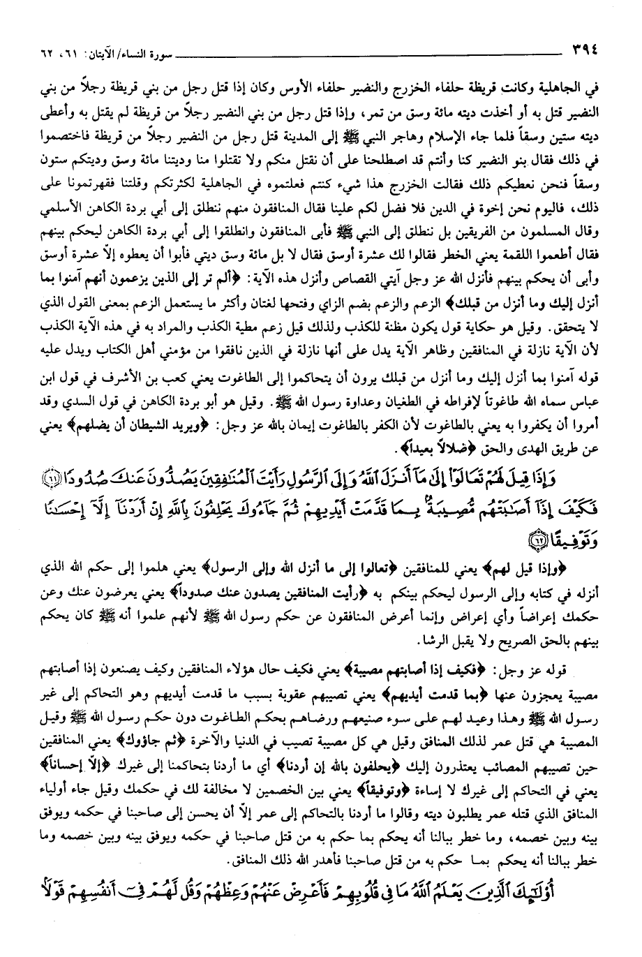 في الجاهلية وكانت قريظة حلفاء الخزرج والنضير حلفاء الأوس وكان إذا قتل رجل من بني قريظة رجلا من بني النضير قتل به أو أخذت ديته مائة وسق من تمر، وإذا قتل رجل من بني النضير رجلا من قريظة لم يقتل به وأعطى ديته ستين وسقا فلما جاء الإسلام وهاجر النبي صلّى الله عليه وسلّم إلى المدينة قتل رجل من النضير رجلا من قريظة فاختصموا في ذلك فقال بنو النضير كنا وأنتم قد اصطلحنا على أن نقتل منكم ولا تقتلوا منا وديتنا مائة وسق وديتكم ستون وسقا فنحن نعطيكم ذلك فقالت الخزرج هذا شيء كنتم فعلتموه في الجاهلية لكثرتكم وقلتنا فقهرتمونا على ذلك، فاليوم نحن إخوة في الدين فلا فضل لكم علينا فقال المنافقون منهم ننطلق إلى أبي بردة الكاهن الأسلمي وقال المسلمون من الفريقين بل ننطلق إلى النبي صلّى الله عليه وسلّم فأبى المنافقون وانطلقوا إلى أبي بردة الكاهن ليحكم بينهم فقال أطعموا اللقمة يعني الخطر فقالوا لك عشرة أوسق فقال لا بل مائة وسق ديتي فأبوا أن يعطوه إلّا عشرة أوسق وأبى أن يحكم بينهم فأنزل الله عز وجل آيتي القصاص وأنزل هذه الآية: أَلَمْ تَرَ إِلَى الَّذِينَ يَزْعُمُونَ أَنَّهُمْ آمَنُوا بِما أُنْزِلَ إِلَيْكَ وَما أُنْزِلَ مِنْ قَبْلِكَ الزعم والزعم بضم الزاي وفتحها لغتان وأكثر ما يستعمل الزعم بمعنى القول الذي لا يتحقق. وقيل هو حكاية قول يكون مظنة للكذب ولذلك قيل زعم مطية الكذب والمراد به في هذه الآية الكذب لأن الآية نازلة في المنافقين وظاهر الآية يدل على أنها نازلة في الذين نافقوا من مؤمني أهل الكتاب ويدل عليه قوله آمنوا بما أنزل إليك وما أنزل من قبلك يرون أن يتحاكموا إلى الطاغوت يعني كعب بن الأشرف في قول ابن عباس سماه الله طاغوتا لإفراطه في الطغيان وعداوة رسول الله صلّى الله عليه وسلّم. وقيل هو أبو بردة الكاهن في قول السدي وقد أمروا أن يكفروا به يعني بالطاغوت لأن الكفر بالطاغوت إيمان بالله عز وجل: وَيُرِيدُ الشَّيْطانُ أَنْ يُضِلَّهُمْ يعني عن طريق الهدى والحق ضَلالًا بَعِيداً.