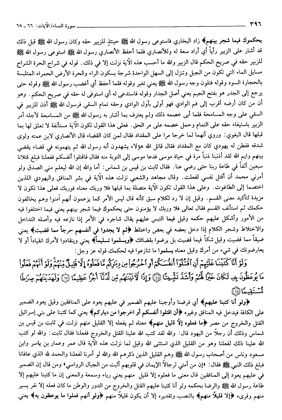 ولو أمرني محمد أن أقتل نفسي لفعلت. وقال مجاهد والشعبي نزلت هذه الآية في بشر المنافق واليهودي اللذين اختصما إلى الطاغوت. وعلى هذا القول تكون الآية متصلة بما قبلها فلا وربك معناه فوربك فعلى هذا تكون لا مزيدة لتأكيد معنى القسم. وقيل إن لا رد لكلام سبق كأنه قال ليس الأمر كما يزعمون أنهم آمنوا وهم يخالفون حكمك ثم استأنف القسم فقال تعالى فلا وربك لا يؤمنون حتى يحكموك فيما شجر بينهم يعني فيما اختلفوا فيه من الأمور وأشكل عليهم حكمه وقيل فيما التبس عليهم يقال شاجره في الأمر إذا نازعه فيه وأصله التداخل والاختلاط وشجر الكلام إذا خل بعضه في بعض واختلط ثُمَّ لا يَجِدُوا فِي أَنْفُسِهِمْ حَرَجاً مِمَّا قَضَيْتَ يعني ضيقا مما قضيت وقيل شكا فيما قضيت بل يرضوا بقضائك وَيُسَلِّمُوا تَسْلِيماً يعني وينقادوا لأمرك انقيادا أو لا يعارضونك في شيء من أمرك وقيل معناه يسلموا ما تنازعوا فيه لحكمك قوله عز وجل: