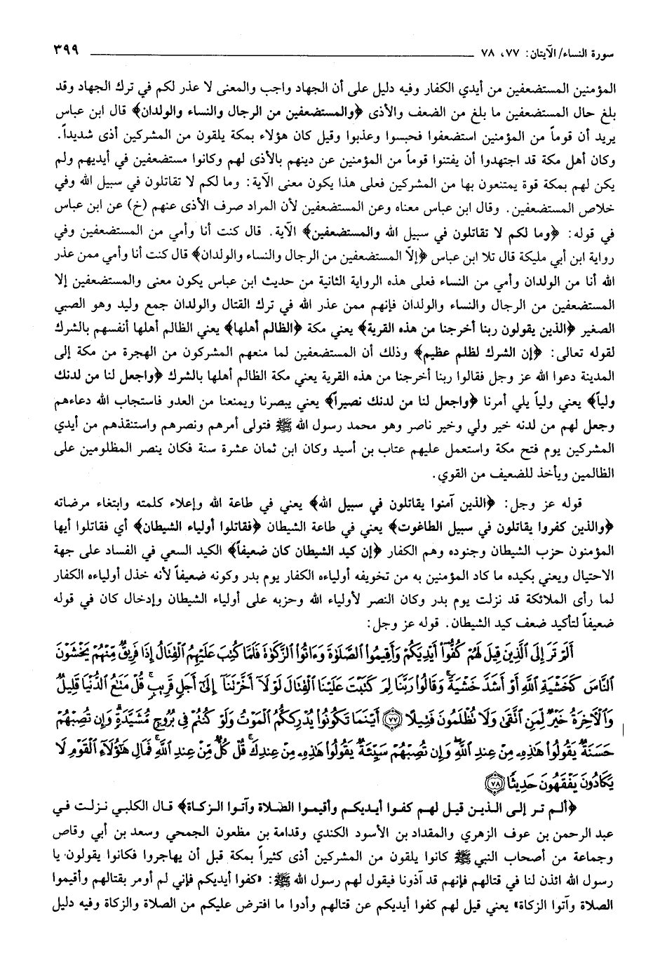 أَلَمْ تَرَ إِلَى الَّذِينَ قِيلَ لَهُمْ كُفُّوا أَيْدِيَكُمْ وَأَقِيمُوا الصَّلاةَ وَآتُوا الزَّكاةَ فَلَمَّا كُتِبَ عَلَيْهِمُ الْقِتالُ إِذا فَرِيقٌ مِنْهُمْ يَخْشَوْنَ النَّاسَ كَخَشْيَةِ اللَّهِ أَوْ أَشَدَّ خَشْيَةً وَقالُوا رَبَّنا لِمَ كَتَبْتَ عَلَيْنَا الْقِتالَ لَوْلا أَخَّرْتَنا إِلى أَجَلٍ قَرِيبٍ قُلْ مَتاعُ الدُّنْيا قَلِيلٌ وَالْآخِرَةُ خَيْرٌ لِمَنِ اتَّقى وَلا تُظْلَمُونَ فَتِيلاً (77) أَيْنَما تَكُونُوا يُدْرِكْكُمُ الْمَوْتُ وَلَوْ كُنْتُمْ فِي بُرُوجٍ مُشَيَّدَةٍ وَإِنْ تُصِبْهُمْ حَسَنَةٌ يَقُولُوا هذِهِ مِنْ عِنْدِ اللَّهِ وَإِنْ تُصِبْهُمْ سَيِّئَةٌ يَقُولُوا هذِهِ مِنْ عِنْدِكَ قُلْ كُلٌّ مِنْ عِنْدِ اللَّهِ فَمالِ هؤُلاءِ الْقَوْمِ لا يَكادُونَ يَفْقَهُونَ حَدِيثاً (78)
