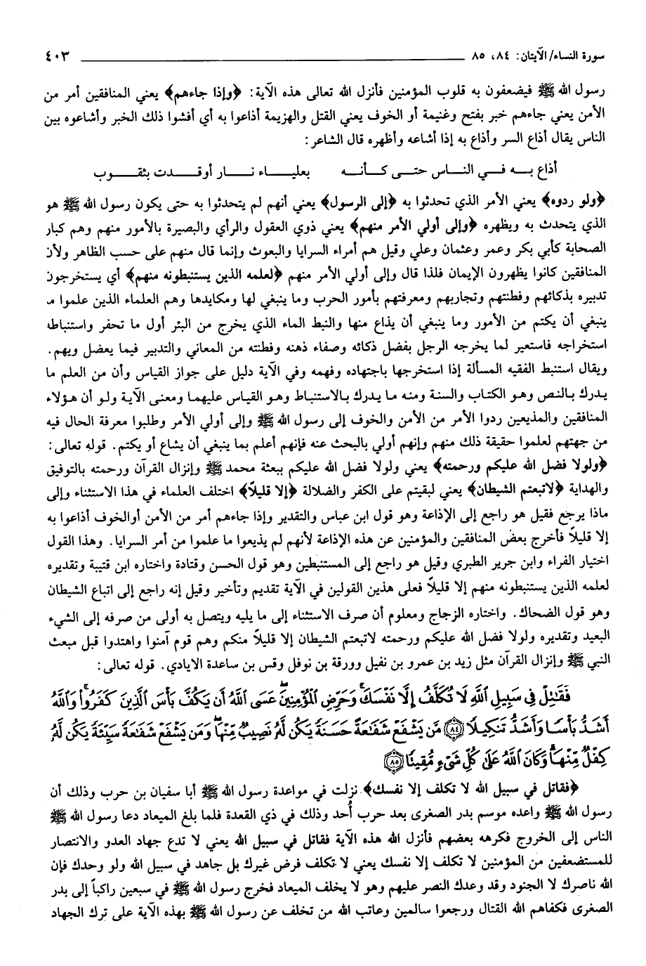 فَقاتِلْ فِي سَبِيلِ اللَّهِ لا تُكَلَّفُ إِلاَّ نَفْسَكَ وَحَرِّضِ الْمُؤْمِنِينَ عَسَى اللَّهُ أَنْ يَكُفَّ بَأْسَ الَّذِينَ كَفَرُوا وَاللَّهُ أَشَدُّ بَأْساً وَأَشَدُّ تَنْكِيلاً (84) مَنْ يَشْفَعْ شَفاعَةً حَسَنَةً يَكُنْ لَهُ نَصِيبٌ مِنْها وَمَنْ يَشْفَعْ شَفاعَةً سَيِّئَةً يَكُنْ لَهُ كِفْلٌ مِنْها وَكانَ اللَّهُ عَلى كُلِّ شَيْءٍ مُقِيتاً (85)