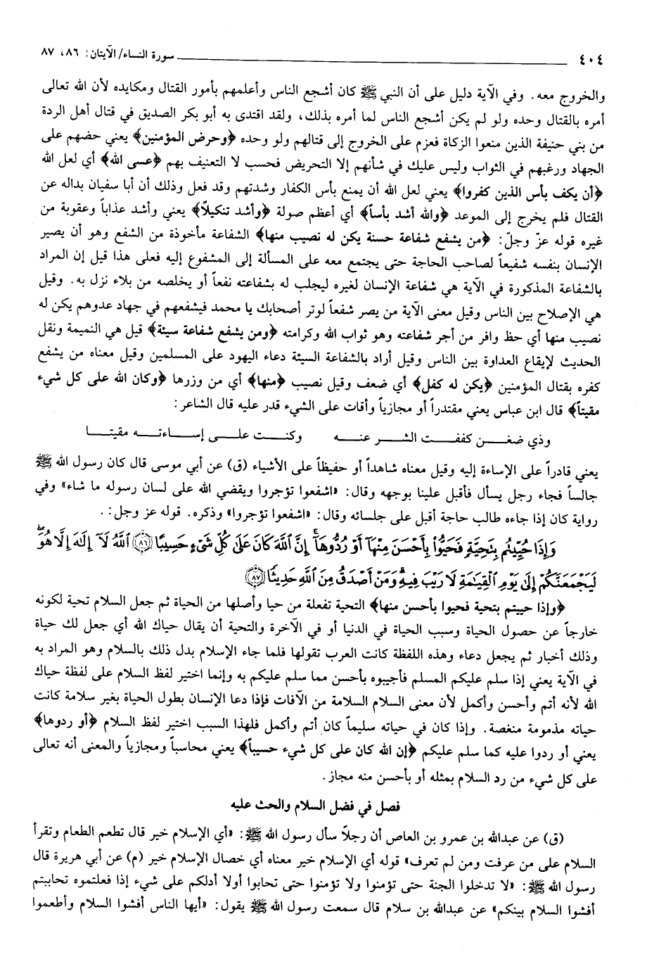 وَإِذا حُيِّيتُمْ بِتَحِيَّةٍ فَحَيُّوا بِأَحْسَنَ مِنْها أَوْ رُدُّوها إِنَّ اللَّهَ كانَ عَلى كُلِّ شَيْءٍ حَسِيباً (86) اللَّهُ لا إِلهَ إِلاَّ هُوَ لَيَجْمَعَنَّكُمْ إِلى يَوْمِ الْقِيامَةِ لا رَيْبَ فِيهِ وَمَنْ أَصْدَقُ مِنَ اللَّهِ حَدِيثاً (87)