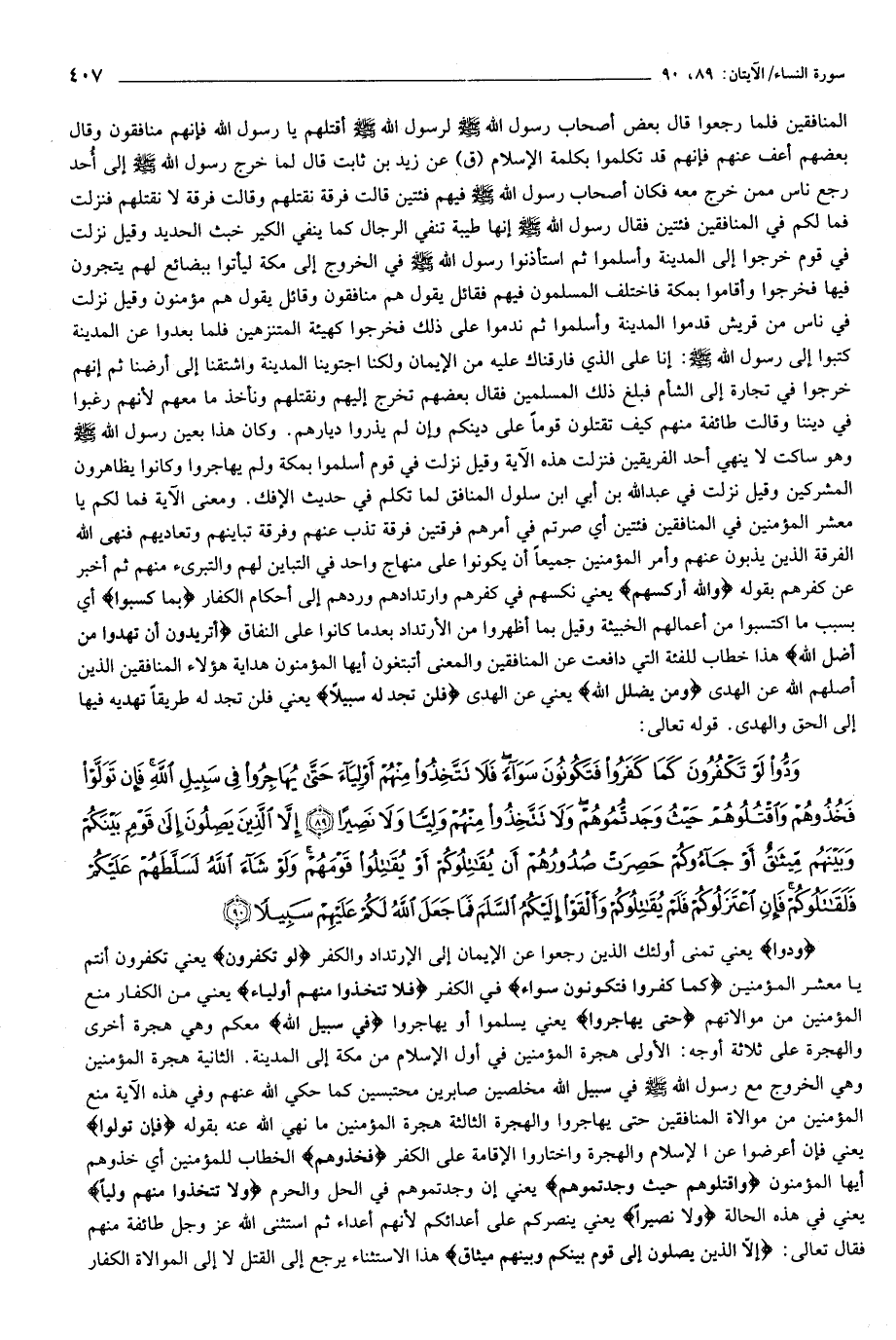 وَدُّوا لَوْ تَكْفُرُونَ كَما كَفَرُوا فَتَكُونُونَ سَواءً فَلا تَتَّخِذُوا مِنْهُمْ أَوْلِياءَ حَتَّى يُهاجِرُوا فِي سَبِيلِ اللَّهِ فَإِنْ تَوَلَّوْا فَخُذُوهُمْ وَاقْتُلُوهُمْ حَيْثُ وَجَدْتُمُوهُمْ وَلا تَتَّخِذُوا مِنْهُمْ وَلِيًّا وَلا نَصِيراً (89) إِلاَّ الَّذِينَ يَصِلُونَ إِلى قَوْمٍ بَيْنَكُمْ وَبَيْنَهُمْ مِيثاقٌ أَوْ جاؤُكُمْ حَصِرَتْ صُدُورُهُمْ أَنْ يُقاتِلُوكُمْ أَوْ يُقاتِلُوا قَوْمَهُمْ وَلَوْ شاءَ اللَّهُ لَسَلَّطَهُمْ عَلَيْكُمْ فَلَقاتَلُوكُمْ فَإِنِ اعْتَزَلُوكُمْ فَلَمْ يُقاتِلُوكُمْ وَأَلْقَوْا إِلَيْكُمُ السَّلَمَ فَما جَعَلَ اللَّهُ لَكُمْ عَلَيْهِمْ سَبِيلاً (90)
