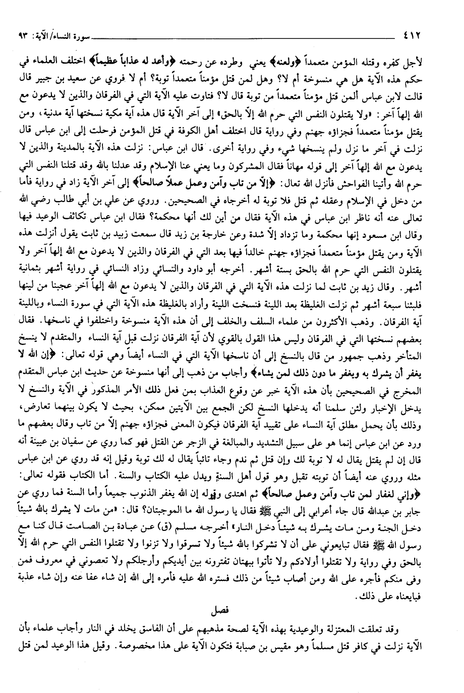لأجل كفره وقتله المؤمن متعمدا وَلَعَنَهُ يعني وطرده عن رحمته وَأَعَدَّ لَهُ عَذاباً عَظِيماً اختلف العلماء في حكم هذه الآية هل هي منسوخة أم لا؟ وهل لمن قتل مؤمنا متعمدا توبة؟ أم لا فروي عن سعيد بن جبير قال قالت لابن عباس ألمن قتل مؤمنا متعمدا من توبة قال لا؟ فتلوت عليه الآية التي في الفرقان والذين لا يدعون مع الله إلها آخر: «ولا يقتلون النفس التي حرم الله إلّا بالحق» إلى آخر الآية قال هذه آية مكية نسختها آية مدنية، ومن يقتل مؤمنا متعمدا فجزاؤه جهنم وفي رواية قال اختلف أهل الكوفة في قتل المؤمن فرحلت إلى ابن عباس قال نزلت في آخر ما نزل ولم ينسخها شيء وفي رواية أخرى. قال ابن عباس: نزلت هذه الآية بالمدينة والذين لا يدعون مع الله إلها آخر إلى قوله مهانا فقال المشركون وما يعني عنا الإسلام وقد عدلنا بالله وقد قتلنا النفس التي حرم الله وأتينا الفواحش فأنزل الله تعالى: إِلَّا مَنْ تابَ وَآمَنَ وَعَمِلَ عَمَلًا صالِحاً إلى آخر الآية زاد في رواية فأما من دخل في الإسلام وعقله ثم قتل فلا توبة له أخرجاه في الصحيحين. وروي عن علي بن أبي طالب رضي الله تعالى عنه أنه ناظر ابن عباس في هذه الآية فقال من أين لك أنها محكمة؟ فقال ابن عباس تكاثف الوعيد فيها وقال ابن مسعود إنها محكمة وما تزداد إلّا شدة وعن خارجة بن زيد قال سمعت زبيد بن ثابت يقول أنزلت هذه الآية ومن يقتل مؤمنا متعمدا فجزاؤه جهنم خالدا فيها بعد التي في الفرقان والذين لا يدعون مع الله إلها آخر ولا يقتلون النفس التي حرم الله بالحق بستة أشهر. أخرجه أبو داود والنسائي وزاد النسائي في رواية أشهر بثمانية أشهر. وقال زيد بن ثابت لما نزلت هذه الآية التي في الفرقان والذين لا يدعون مع الله إلها آخر عجبنا من لينها فلبثنا سبعة أشهر ثم نزلت الغليظة بعد اللينة فنسخت اللينة وأراد بالغليظة هذه الآية التي في سورة النساء وباللينة آية الفرقان. وذهب الأكثرون من علماء السلف والخلف إلى أن هذه الآية منسوخة واختلفوا في ناسخها. فقال بعضهم نسختها التي في الفرقان وليس هذا القول بالقوي لأن آية الفرقان نزلت قبل آية النساء والمتقدم لا ينسخ المتأخر وذهب جمهور من قال بالنسخ إلى أن ناسخها الآية التي في النساء أيضا وهي قوله تعالى: إِنَّ اللَّهَ لا يَغْفِرُ أَنْ يُشْرَكَ بِهِ وَيَغْفِرُ ما دُونَ ذلِكَ لِمَنْ يَشاءُ وأجاب من ذهب إلى أنها منسوخة عن حديث ابن عباس المتقدم المخرج في الصحيحين بأن هذه الآية خبر عن وقوع العذاب بمن فعل ذلك الأمر المذكور في الآية والنسخ لا يدخل الإخبار ولئن سلمنا أنه يدخلها النسخ لكن الجمع بين الآيتين ممكن، بحيث لا يكون بينهما تعارض، وذلك بأن يحمل مطلق آية النساء على تقييد آية الفرقان فيكون المعنى فجزاؤه جهنم إلّا من تاب وقال بعضهم ما ورد عن ابن عباس إنما هو على سبيل التشديد والمبالغة في الزجر عن القتل فهو كما روي عن سفيان بن عيينة أنه قال إن لم يقتل يقال له لا توبة لك وإن قتل ثم ندم وجاء تائبا يقال له لك توبة وقيل إنه قد روي عن ابن عباس مثله وروي عنه أيضا أن توبته تقبل وهو قول أهل السنة ويدل عليه الكتاب والسنة. أما الكتاب فقوله تعالى: