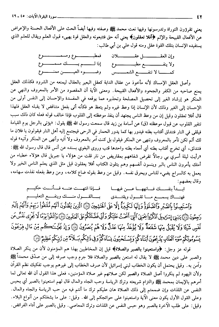 وَاسْتَعِينُوا بِالصَّبْرِ وَالصَّلاةِ وَإِنَّها لَكَبِيرَةٌ إِلاَّ عَلَى الْخاشِعِينَ (45) الَّذِينَ يَظُنُّونَ أَنَّهُمْ مُلاقُوا رَبِّهِمْ وَأَنَّهُمْ إِلَيْهِ راجِعُونَ (46) يا بَنِي إِسْرائِيلَ اذْكُرُوا نِعْمَتِيَ الَّتِي أَنْعَمْتُ عَلَيْكُمْ وَأَنِّي فَضَّلْتُكُمْ عَلَى الْعالَمِينَ (47) وَاتَّقُوا يَوْماً لا تَجْزِي نَفْسٌ عَنْ نَفْسٍ شَيْئاً وَلا يُقْبَلُ مِنْها شَفاعَةٌ وَلا يُؤْخَذُ مِنْها عَدْلٌ وَلا هُمْ يُنْصَرُونَ (48) وَإِذْ نَجَّيْناكُمْ مِنْ آلِ فِرْعَوْنَ يَسُومُونَكُمْ سُوءَ الْعَذابِ يُذَبِّحُونَ أَبْناءَكُمْ وَيَسْتَحْيُونَ نِساءَكُمْ وَفِي ذلِكُمْ بَلاءٌ مِنْ رَبِّكُمْ عَظِيمٌ (49)