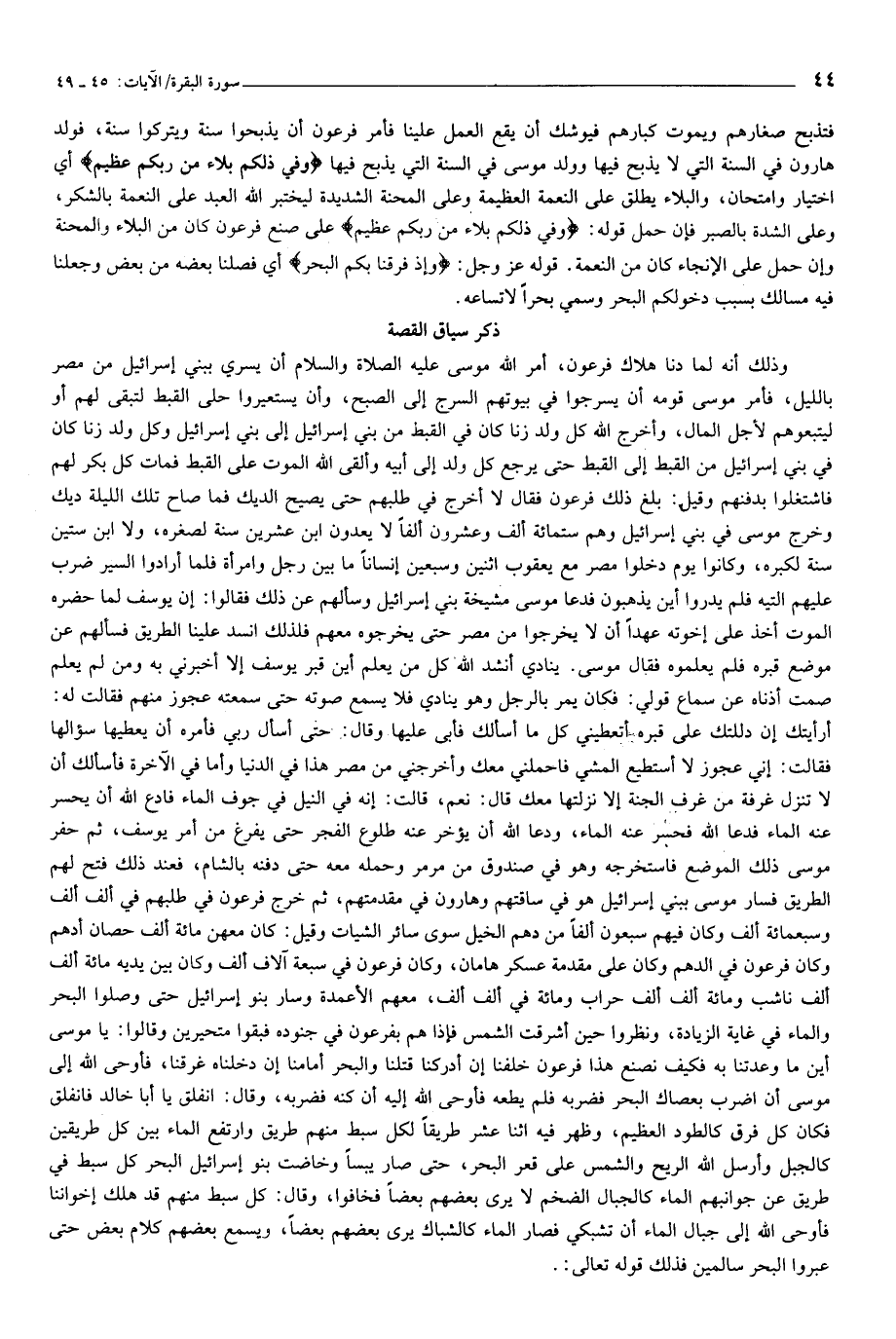 فتذبح صغارهم ويموت كبارهم فيوشك أن يقع العمل علينا فأمر فرعون أن يذبحوا سنة ويتركوا سنة، فولد هارون في السنة التي لا يذبح فيها وولد موسى في السنة التي يذبح فيها وَفِي ذلِكُمْ بَلاءٌ مِنْ رَبِّكُمْ عَظِيمٌ أي اختيار وامتحان، والبلاء يطلق على النعمة العظيمة وعلى المحنة الشديدة ليختبر الله العبد على النعمة بالشكر، وعلى الشدة بالصبر فإن حمل قوله: وَفِي ذلِكُمْ بَلاءٌ مِنْ رَبِّكُمْ عَظِيمٌ على صنع فرعون كان من البلاء والمحنة وإن حمل على الإنجاء كان من النعمة. قوله عز وجل: وَإِذْ فَرَقْنا بِكُمُ الْبَحْرَ أي فصلنا بعضه من بعض وجعلنا فيه مسالك بسبب دخولكم البحر وسمي بحرا لاتساعه.