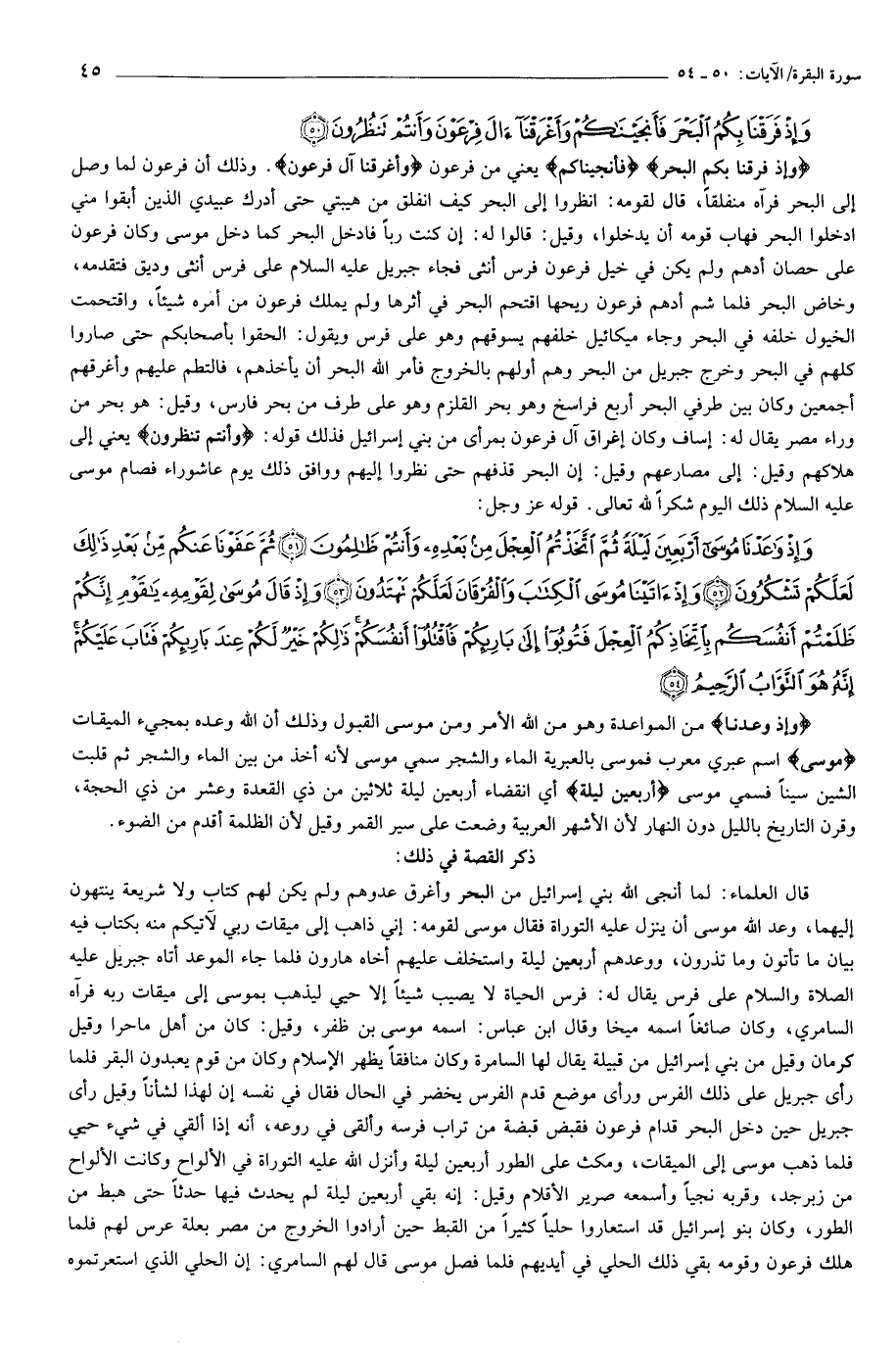 وَإِذْ فَرَقْنا بِكُمُ الْبَحْرَ فَأَنْجَيْناكُمْ يعني من فرعون وَأَغْرَقْنا آلَ فِرْعَوْنَ. وذلك أن فرعون لما وصل إلى البحر فرآه منفلقا، قال لقومه: انظروا إلى البحر كيف انفلق من هيبتي حتى أدرك عبيدي الذين أبقوا مني ادخلوا البحر فهاب قومه أن يدخلوا، وقيل: قالوا له: إن كنت ربا فادخل البحر كما دخل موسى وكان فرعون على حصان أدهم ولم يكن في خيل فرعون فرس أنثى فجاء جبريل عليه السلام على فرس أنثى وديق فتقدمه، وخاض البحر فلما شم أدهم فرعون ريحها اقتحم البحر في أثرها ولم يملك فرعون من أمره شيئا، واقتحمت الخيول خلفه في البحر وجاء ميكائيل خلفهم يسوقهم وهو على فرس ويقول: الحقوا بأصحابكم حتى صاروا كلهم في البحر وخرج جبريل من البحر وهم أولهم بالخروج فأمر الله البحر أن يأخذهم، فالتطم عليهم وأغرقهم أجمعين وكان بين طرفي البحر أربع فراسخ وهو بحر القلزم وهو على طرف من بحر فارس، وقيل: هو بحر من وراء مصر يقال له: إساف وكان إغراق آل فرعون بمرأى من بني إسرائيل فذلك قوله: وَأَنْتُمْ تَنْظُرُونَ يعني إلى هلاكهم وقيل: إلى مصارعهم وقيل: إن البحر قذفهم حتى نظروا إليهم ووافق ذلك يوم عاشوراء فصام موسى عليه السلام ذلك اليوم شكرا لله تعالى. قوله عز وجل: