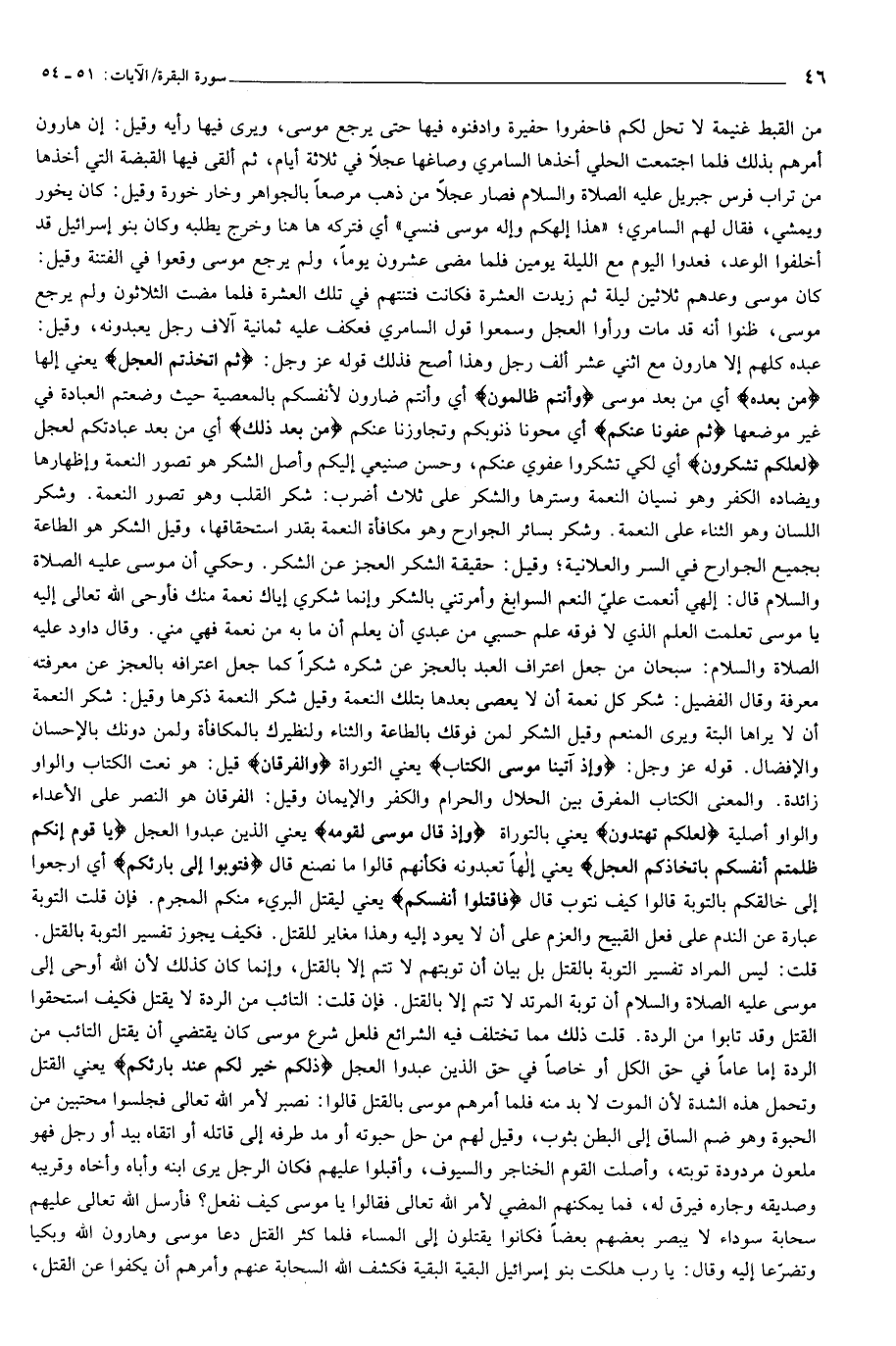 عبده كلهم إلا هارون مع اثني عشر ألف رجل وهذا أصح فذلك قوله عز وجل: ثُمَّ اتَّخَذْتُمُ الْعِجْلَ يعني إلها مِنْ بَعْدِهِ أي من بعد موسى وَأَنْتُمْ ظالِمُونَ أي وأنتم ضارون لأنفسكم بالمعصية حيث وضعتم العبادة في غير موضعها ثُمَّ عَفَوْنا عَنْكُمْ أي محونا ذنوبكم وتجاوزنا عنكم مِنْ بَعْدِ ذلِكَ أي من بعد عبادتكم لعجل لَعَلَّكُمْ تَشْكُرُونَ أي لكي تشكروا عفوي عنكم، وحسن صنيعي إليكم وأصل الشكر هو تصور النعمة وإظهارها ويضاده الكفر وهو نسيان النعمة وسترها والشكر على ثلاث أضرب: شكر القلب وهو تصور النعمة. وشكر اللسان وهو الثناء على النعمة. وشكر بسائر الجوارح وهو مكافأة النعمة بقدر استحقاقها، وقيل الشكر هو الطاعة بجميع الجوارح في السر والعلانية وقيل: حقيقة الشكر العجز عن الشكر. وحكي أن موسى عليه الصلاة والسلام قال: إلهي أنعمت عليّ النعم السوابغ وأمرتني بالشكر وإنما شكري إياك نعمة منك فأوحى الله تعالى إليه يا موسى تعلمت العلم الذي لا فوقه علم حسبي من عبدي أن يعلم أن ما به من نعمة فهي مني. وقال داود عليه الصلاة والسلام: سبحان من جعل اعتراف العبد بالعجز عن شكره شكرا كما جعل اعترافه بالعجز عن معرفته معرفة وقال الفضيل: شكر كل نعمة أن لا يعصى بعدها بتلك النعمة وقيل شكر النعمة ذكرها وقيل: شكر النعمة أن لا يراها البتة ويرى المنعم وقيل الشكر لمن فوقك بالطاعة والثناء ولنظيرك بالمكافأة ولمن دونك بالإحسان والإفضال. قوله عز وجل: وَإِذْ آتَيْنا مُوسَى الْكِتابَ يعني التوراة وَالْفُرْقانَ قيل: هو نعت الكتاب والواو زائدة. والمعنى الكتاب المفرق بين الحلال والحرام والكفر والإيمان وقيل: الفرقان هو النصر على الأعداء والواو أصلية لَعَلَّكُمْ تَهْتَدُونَ يعني بالتوراة وَإِذْ قالَ مُوسى لِقَوْمِهِ يعني الذين عبدوا العجل يا قَوْمِ إِنَّكُمْ ظَلَمْتُمْ أَنْفُسَكُمْ بِاتِّخاذِكُمُ الْعِجْلَ يعني إلها تعبدونه فكأنهم قالوا ما نصنع قال فَتُوبُوا إِلى بارِئِكُمْ أي ارجعوا إلى خالقكم بالتوبة قالوا كيف نتوب قال فَاقْتُلُوا أَنْفُسَكُمْ يعني ليقتل البريء منكم المجرم. فإن قلت التوبة عبارة عن الندم على فعل القبيح والعزم على أن لا يعود إليه وهذا مغاير للقتل. فكيف يجوز تفسير التوبة بالقتل.