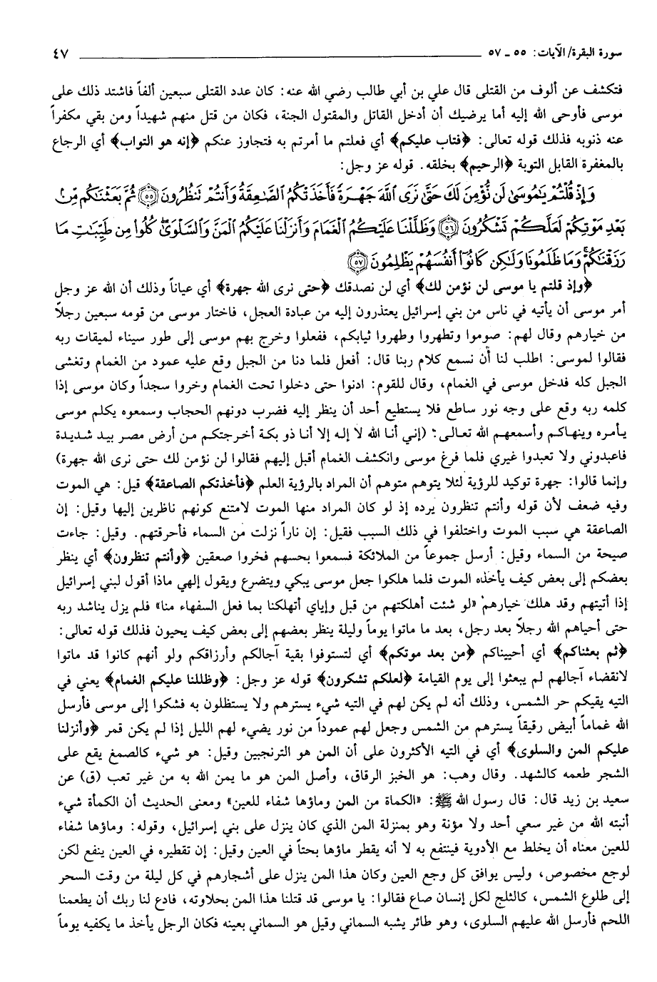 وَإِذْ قُلْتُمْ يا مُوسى لَنْ نُؤْمِنَ لَكَ حَتَّى نَرَى اللَّهَ جَهْرَةً فَأَخَذَتْكُمُ الصَّاعِقَةُ وَأَنْتُمْ تَنْظُرُونَ (55) ثُمَّ بَعَثْناكُمْ مِنْ بَعْدِ مَوْتِكُمْ لَعَلَّكُمْ تَشْكُرُونَ (56) وَظَلَّلْنا عَلَيْكُمُ الْغَمامَ وَأَنْزَلْنا عَلَيْكُمُ الْمَنَّ وَالسَّلْوى كُلُوا مِنْ طَيِّباتِ ما رَزَقْناكُمْ وَما ظَلَمُونا وَلكِنْ كانُوا أَنْفُسَهُمْ يَظْلِمُونَ (57)