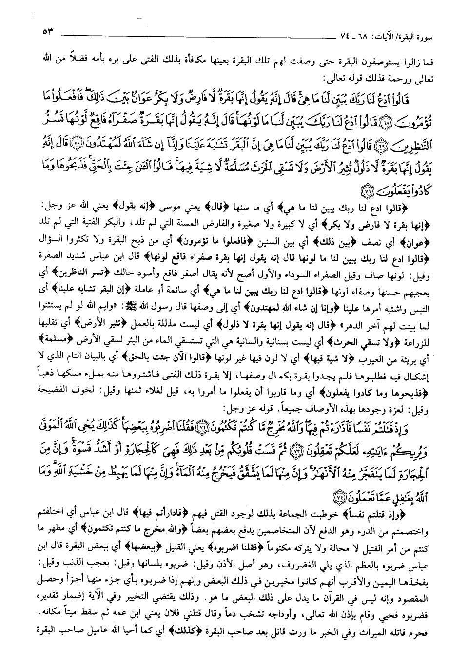 قالُوا ادْعُ لَنا رَبَّكَ يُبَيِّنْ لَنا ما هِيَ قالَ إِنَّهُ يَقُولُ إِنَّها بَقَرَةٌ لا فارِضٌ وَلا بِكْرٌ عَوانٌ بَيْنَ ذلِكَ فَافْعَلُوا ما تُؤْمَرُونَ (68) قالُوا ادْعُ لَنا رَبَّكَ يُبَيِّنْ لَنا ما لَوْنُها قالَ إِنَّهُ يَقُولُ إِنَّها بَقَرَةٌ صَفْراءُ فاقِعٌ لَوْنُها تَسُرُّ النَّاظِرِينَ (69) قالُوا ادْعُ لَنا رَبَّكَ يُبَيِّنْ لَنا ما هِيَ إِنَّ الْبَقَرَ تَشابَهَ عَلَيْنا وَإِنَّا إِنْ شاءَ اللَّهُ لَمُهْتَدُونَ (70) قالَ إِنَّهُ يَقُولُ إِنَّها بَقَرَةٌ لا ذَلُولٌ تُثِيرُ الْأَرْضَ وَلا تَسْقِي الْحَرْثَ مُسَلَّمَةٌ لا شِيَةَ فِيها قالُوا الْآنَ جِئْتَ بِالْحَقِّ فَذَبَحُوها وَما كادُوا يَفْعَلُونَ (71)