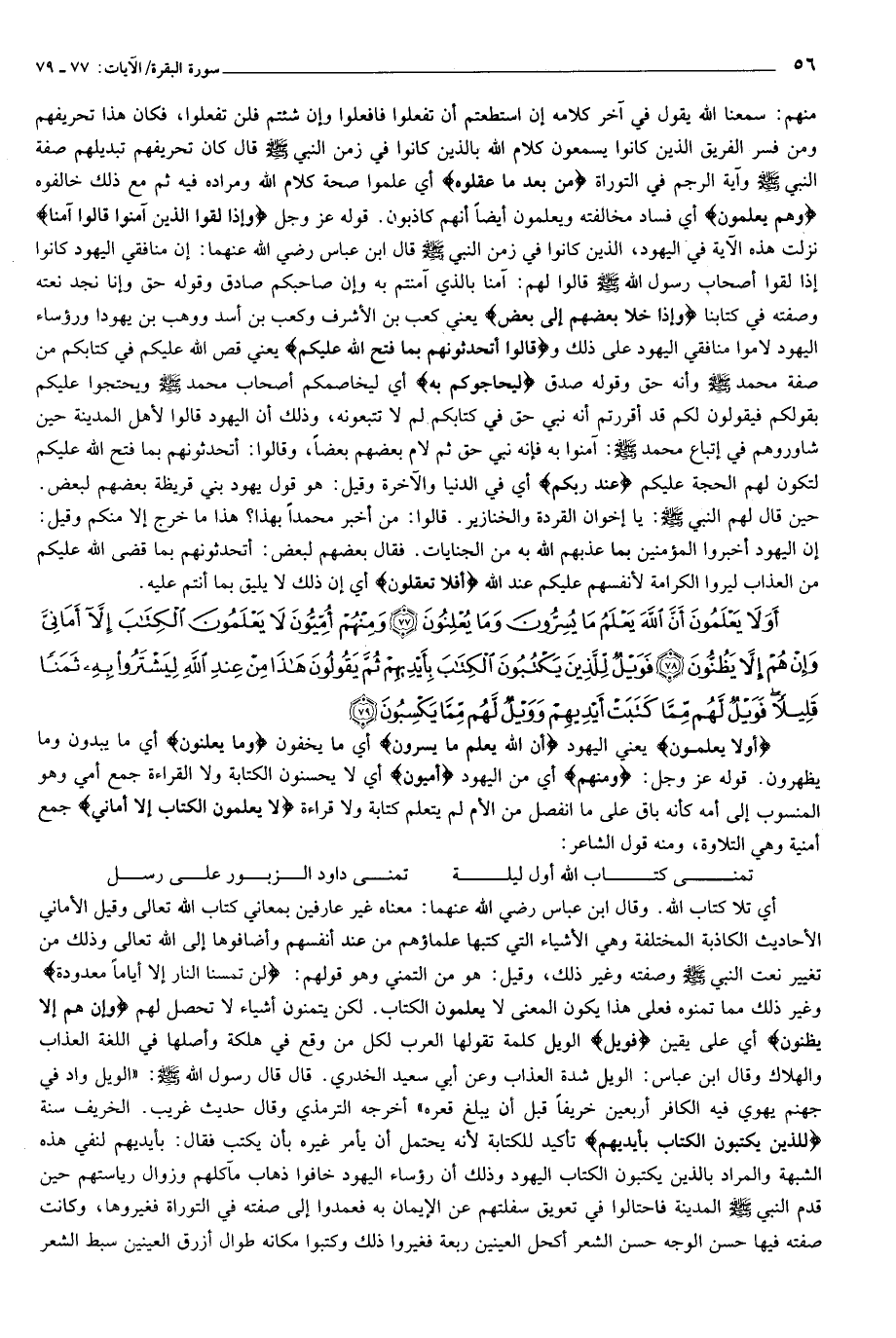 أَوَلا يَعْلَمُونَ أَنَّ اللَّهَ يَعْلَمُ ما يُسِرُّونَ وَما يُعْلِنُونَ (77) وَمِنْهُمْ أُمِّيُّونَ لا يَعْلَمُونَ الْكِتابَ إِلاَّ أَمانِيَّ وَإِنْ هُمْ إِلاَّ يَظُنُّونَ (78) فَوَيْلٌ لِلَّذِينَ يَكْتُبُونَ الْكِتابَ بِأَيْدِيهِمْ ثُمَّ يَقُولُونَ هذا مِنْ عِنْدِ اللَّهِ لِيَشْتَرُوا بِهِ ثَمَناً قَلِيلاً فَوَيْلٌ لَهُمْ مِمَّا كَتَبَتْ أَيْدِيهِمْ وَوَيْلٌ لَهُمْ مِمَّا يَكْسِبُونَ (79)