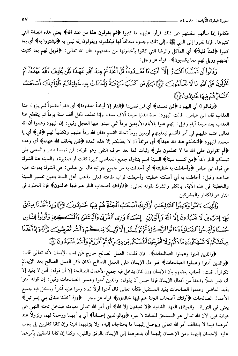 وَالَّذِينَ آمَنُوا وَعَمِلُوا الصَّالِحاتِ أُولئِكَ أَصْحابُ الْجَنَّةِ هُمْ فِيها خالِدُونَ (82) وَإِذْ أَخَذْنا مِيثاقَ بَنِي إِسْرائِيلَ لا تَعْبُدُونَ إِلاَّ اللَّهَ وَبِالْوالِدَيْنِ إِحْساناً وَذِي الْقُرْبى وَالْيَتامى وَالْمَساكِينِ وَقُولُوا لِلنَّاسِ حُسْناً وَأَقِيمُوا الصَّلاةَ وَآتُوا الزَّكاةَ ثُمَّ تَوَلَّيْتُمْ إِلاَّ قَلِيلاً مِنْكُمْ وَأَنْتُمْ مُعْرِضُونَ (83) وَإِذْ أَخَذْنا مِيثاقَكُمْ لا تَسْفِكُونَ دِماءَكُمْ وَلا تُخْرِجُونَ أَنْفُسَكُمْ مِنْ دِيارِكُمْ ثُمَّ أَقْرَرْتُمْ وَأَنْتُمْ تَشْهَدُونَ (84)