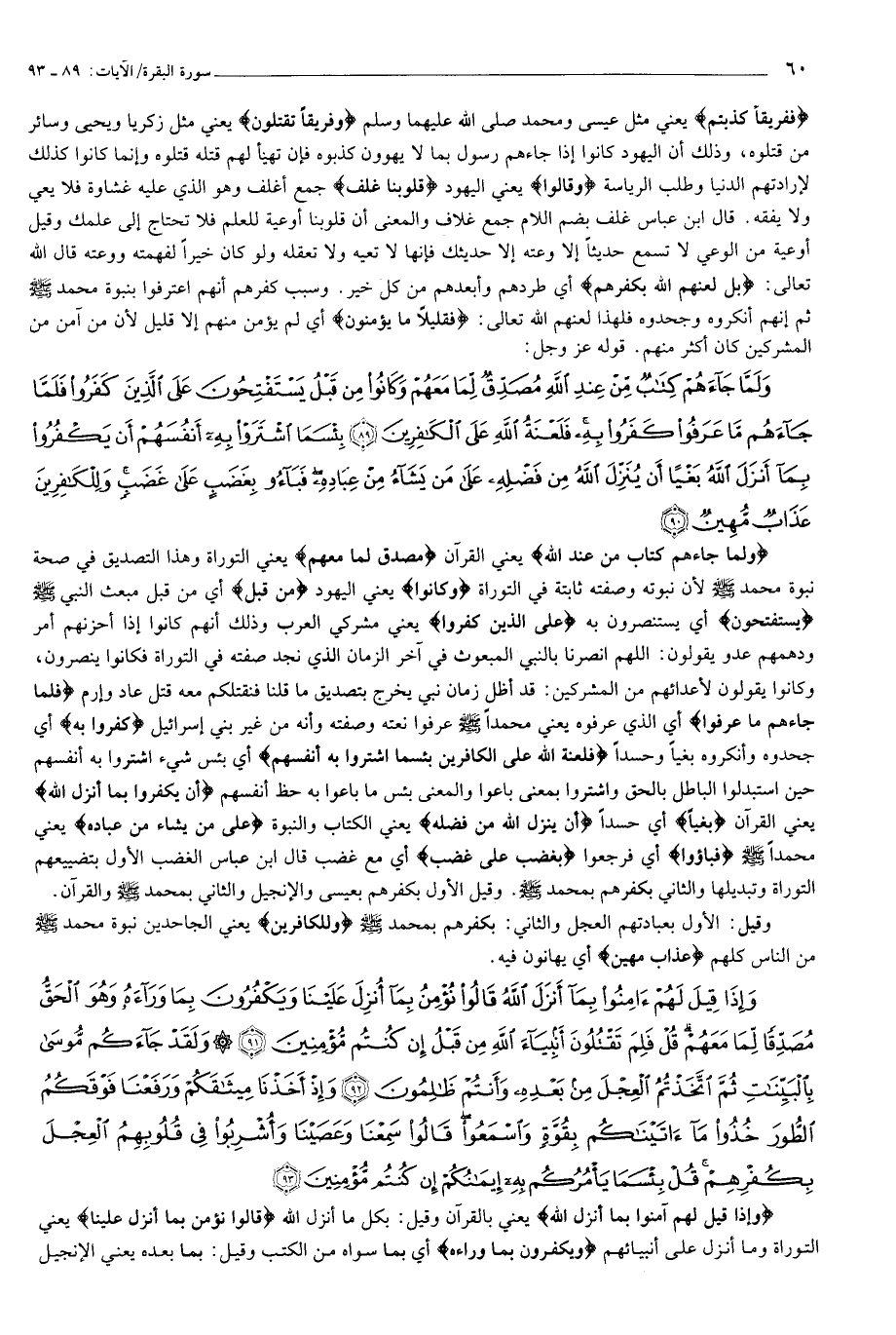 وَلَمَّا جاءَهُمْ كِتابٌ مِنْ عِنْدِ اللَّهِ يعني القرآن مُصَدِّقٌ لِما مَعَهُمْ يعني التوراة وهذا التصديق في صحة نبوة محمد صلّى الله عليه وسلّم لأن نبوته وصفته ثابتة في التوراة وَكانُوا يعني اليهود مِنْ قَبْلُ أي من قبل مبعث النبي صلّى الله عليه وسلّم يَسْتَفْتِحُونَ أي يستنصرون به عَلَى الَّذِينَ كَفَرُوا يعني مشركي العرب وذلك أنهم كانوا إذا أحزنهم أمر ودهمهم عدو يقولون: اللهم انصرنا بالنبي المبعوث في آخر الزمان الذي نجد صفته في التوراة فكانوا ينصرون، وكانوا يقولون لأعدائهم من المشركين: قد أظل زمان نبي يخرج بتصديق ما قلنا فنقتلكم معه قتل عاد وإرم فَلَمَّا جاءَهُمْ ما عَرَفُوا أي الذي عرفوه يعني محمدا صلّى الله عليه وسلّم عرفوا نعته وصفته وأنه من غير بني إسرائيل كَفَرُوا بِهِ أي جحدوه وأنكروه بغيا وحسدا فَلَعْنَةُ اللَّهِ عَلَى الْكافِرِينَ بِئْسَمَا اشْتَرَوْا بِهِ أَنْفُسَهُمْ أي بئس شيء اشتروا به أنفسهم حين استبدلوا الباطل بالحق واشتروا بمعنى باعوا والمعنى بئس ما باعوا به حظ أنفسهم أَنْ يَكْفُرُوا بِما أَنْزَلَ اللَّهُ يعني القرآن بَغْياً أي حسدا أَنْ يُنَزِّلَ اللَّهُ مِنْ فَضْلِهِ يعني الكتاب والنبوة عَلى مَنْ يَشاءُ مِنْ عِبادِهِ يعني محمدا صلّى الله عليه وسلّم فَباؤُ أي فرجعوا بِغَضَبٍ عَلى غَضَبٍ أي مع غضب قال ابن عباس الغضب الأول بتضييعهم التوراة وتبديلها والثاني بكفرهم بمحمد صلّى الله عليه وسلّم. وقيل الأول بكفرهم بعيسى والإنجيل والثاني بمحمد صلّى الله عليه وسلّم والقرآن.