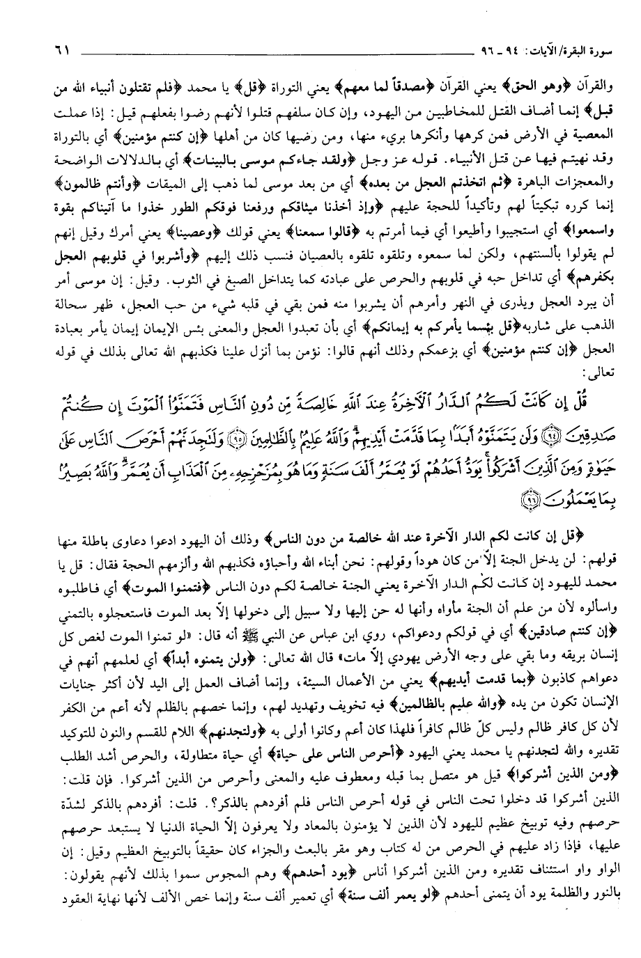قُلْ إِنْ كانَتْ لَكُمُ الدَّارُ الْآخِرَةُ عِنْدَ اللَّهِ خالِصَةً مِنْ دُونِ النَّاسِ فَتَمَنَّوُا الْمَوْتَ إِنْ كُنْتُمْ صادِقِينَ (94) وَلَنْ يَتَمَنَّوْهُ أَبَداً بِما قَدَّمَتْ أَيْدِيهِمْ وَاللَّهُ عَلِيمٌ بِالظَّالِمِينَ (95) وَلَتَجِدَنَّهُمْ أَحْرَصَ النَّاسِ عَلى حَياةٍ وَمِنَ الَّذِينَ أَشْرَكُوا يَوَدُّ أَحَدُهُمْ لَوْ يُعَمَّرُ أَلْفَ سَنَةٍ وَما هُوَ بِمُزَحْزِحِهِ مِنَ الْعَذابِ أَنْ يُعَمَّرَ وَاللَّهُ بَصِيرٌ بِما يَعْمَلُونَ (96)