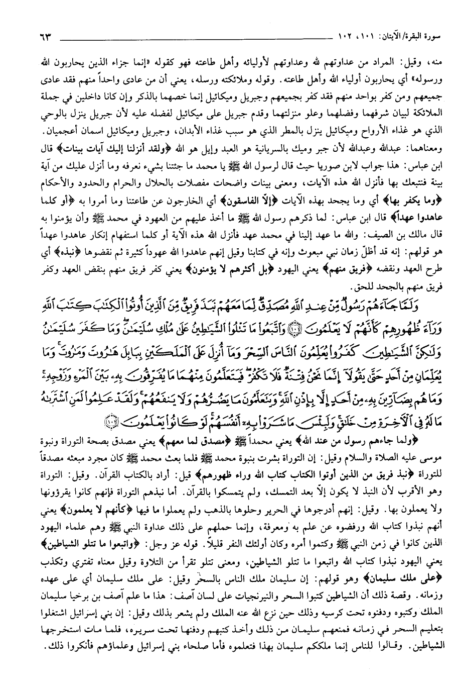 وَلَمَّا جاءَهُمْ رَسُولٌ مِنْ عِنْدِ اللَّهِ يعني محمدا صلّى الله عليه وسلّم مُصَدِّقٌ لِما مَعَهُمْ يعني مصدق بصحة التوراة ونبوة موسى عليه الصلاة والسلام وقيل: إن التوراة بشرت بنبوة محمد صلّى الله عليه وسلّم فلما بعث محمد صلّى الله عليه وسلّم كان مجرد مبعثه مصدقا للتوراة نَبَذَ فَرِيقٌ مِنَ الَّذِينَ أُوتُوا الْكِتابَ كِتابَ اللَّهِ وَراءَ ظُهُورِهِمْ قيل: أراد بالكتاب القرآن. وقيل: التوراة وهو الأقرب لأن النبذ لا يكون إلّا بعد التمسك، ولم يتمسكوا بالقرآن. أما نبذهم التوراة فإنهم كانوا يقرءونها ولا يعملون بها. وقيل: إنهم أدرجوها في الحرير وحلوها بالذهب ولم يعملوا ما فيها كَأَنَّهُمْ لا يَعْلَمُونَ يعني أنهم نبذوا كتاب الله ورفضوه عن علم به ومعرفة، وإنما حملهم على ذلك عداوة النبي صلّى الله عليه وسلّم وهم علماء اليهود الذين كانوا في زمن النبي صلّى الله عليه وسلّم وكتموا أمره وكان أولئك النفر قليلا. قوله عز وجل: وَاتَّبَعُوا ما تَتْلُوا الشَّياطِينُ يعني اليهود نبذوا كتاب الله واتبعوا ما تتلو الشياطين، ومعنى تتلو تقرأ من التلاوة وقيل معناه تفتري وتكذب عَلى مُلْكِ سُلَيْمانَ وهو قولهم: إن سليمان ملك الناس بالسحر وقيل: على ملك سليمان أي على عهده وزمانه. وقصة ذلك أن الشياطين كتبوا السحر والنيرنجيات على لسان آصف: هذا ما علم آصف بن برخيا سليمان الملك وكتبوه ودفنوه تحت كرسيه وذلك حين نزع الله عنه الملك ولم يشعر بذلك وقيل: إن بني إسرائيل اشتغلوا بتعليم السحر في زمانه فمنعهم سليمان من ذلك وأخذ كتبهم ودفنها تحت سريره، فلما مات استخرجها الشياطين. وقالوا للناس إنما ملككم سليمان بهذا فتعلموه فأما صلحاء بني إسرائيل وعلماؤهم فأنكروا ذلك.