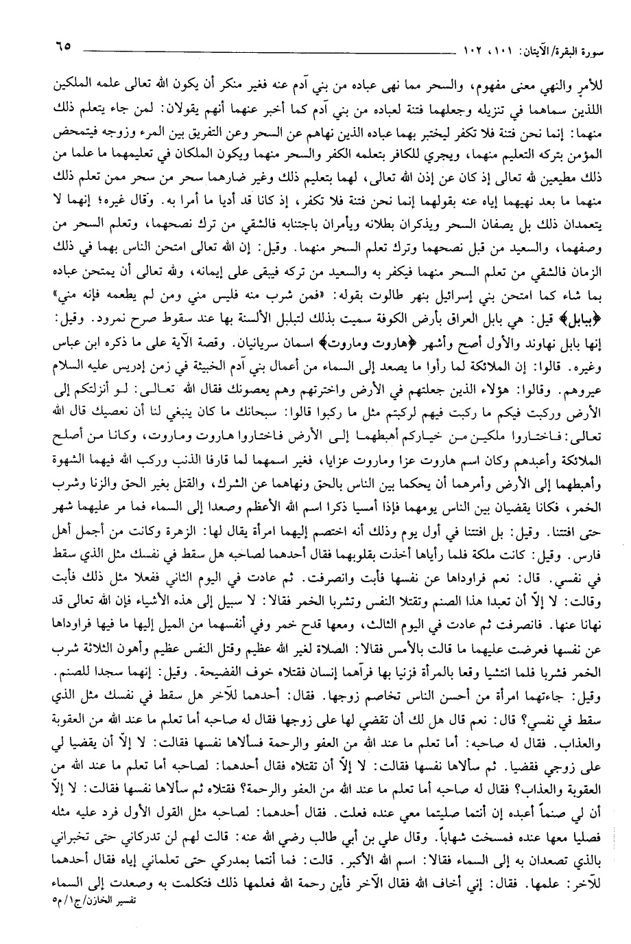 للأمر والنهي معنى مفهوم، والسحر مما نهى عباده من بني آدم عنه فغير منكر أن يكون الله تعالى علمه الملكين اللذين سماهما في تنزيله وجعلهما فتنة لعباده من بني آدم كما أخبر عنهما أنهم يقولان: لمن جاء يتعلم ذلك منهما: إنما نحن فتنة فلا تكفر ليختبر بهما عباده الذين نهاهم عن السحر وعن التفريق بين المرء وزوجه فيتمحض المؤمن بتركه التعليم منهما، ويجري للكافر بتعلمه الكفر والسحر منهما ويكون الملكان في تعليمهما ما علما من ذلك مطيعين لله تعالى إذ كان عن إذن الله تعالى، لهما بتعليم ذلك وغير ضارهما سحر من سحر ممن تعلم ذلك منهما ما بعد نهيهما إياه عنه بقولهما إنما نحن فتنة فلا تكفر، إذ كانا قد أديا ما أمرا به. وقال غيره إنهما لا يتعمدان ذلك بل يصفان السحر ويذكران بطلانه ويأمران باجتنابه فالشقي من ترك نصحهما، وتعلم السحر من وصفهما، والسعيد من قبل نصحهما وترك تعلم السحر منهما. وقيل: إن الله تعالى امتحن الناس بهما في ذلك الزمان فالشقي من تعلم السحر منهما فيكفر به والسعيد من تركه فيبقى على إيمانه، ولله تعالى أن يمتحن عباده بما شاء كما امتحن بني إسرائيل بنهر طالوت بقوله: «فمن شرب منه فليس مني ومن لم يطعمه فإنه مني» بِبابِلَ قيل: هي بابل العراق بأرض الكوفة سميت بذلك لتبلبل الألسنة بها عند سقوط صرح نمرود. وقيل:
