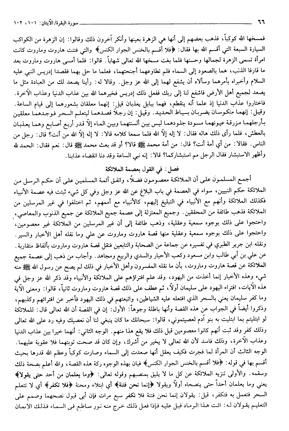 عن علي بن أبي طالب وابن مسعود وكعب الأحبار والسدي والربيع ومجاهد. وأجاب من ذهب إلى عصمة جميع الملائكة عن قصة هاروت وماروت، بأن ما نقله المفسرون وأهل الأخبار في ذلك لم يصح عن رسول الله صلّى الله عليه وسلّم منه شيء وهذه الأخبار إنما أخذت من اليهود، وقد علم افتراؤهم على الملائكة والأنبياء وقد ذكر الله عز وجل في هذه الآيات، افتراء اليهود على سليمان أولا، ثم عطف على ذلك قصة هاروت وماروت ثانيا، قالوا: ومعنى الآية وما كفر سليمان يعني بالسحر الذي افتعله عليه الشياطين، واتبعتهم في ذلك اليهود فأخبر عن افترائهم وكذبهم، وذكروا أيضا في الجواب عن هذه القصة وأنها باطلة وجوها: الأول: إن في القصة أن الله تعالى قال: للملائكة لو ابتليتم بما ابتليت به بنو آدم لعصيتموني، قالوا: سبحانك ما كان ينبغي لنا أن نعصيك وفيه رد على الله تعالى وذلك كفر وقد ثبت أنهم كانوا معصومين قبل ذلك فلا يقع هذا منهم. الوجه الثاني: أنهما خيرا بين عذاب الدنيا وعذاب الآخرة، وذلك فاسد لأن الله تعالى لا يخير من أشرك، وإن كان قد صحت توبتهما فلا عقوبة عليهما.