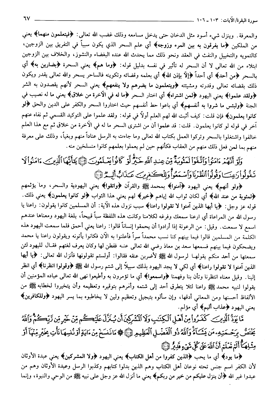وَلَوْ أَنَّهُمْ آمَنُوا وَاتَّقَوْا لَمَثُوبَةٌ مِنْ عِنْدِ اللَّهِ خَيْرٌ لَوْ كانُوا يَعْلَمُونَ (103) يا أَيُّهَا الَّذِينَ آمَنُوا لا تَقُولُوا راعِنا وَقُولُوا انْظُرْنا وَاسْمَعُوا وَلِلْكافِرِينَ عَذابٌ أَلِيمٌ (104)