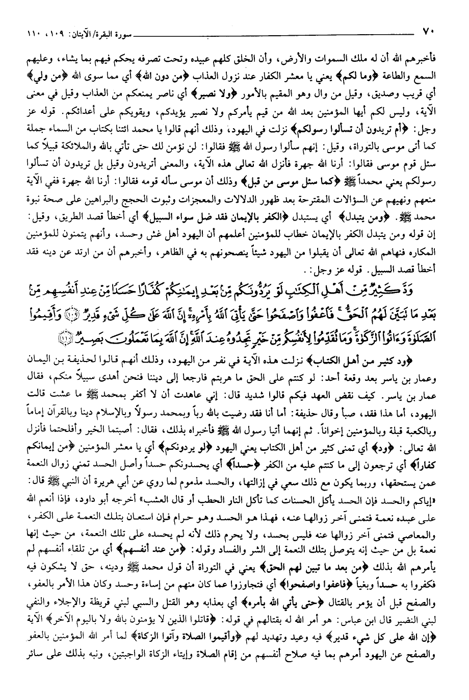 وَدَّ كَثِيرٌ مِنْ أَهْلِ الْكِتابِ لَوْ يَرُدُّونَكُمْ مِنْ بَعْدِ إِيمانِكُمْ كُفَّاراً حَسَداً مِنْ عِنْدِ أَنْفُسِهِمْ مِنْ بَعْدِ ما تَبَيَّنَ لَهُمُ الْحَقُّ فَاعْفُوا وَاصْفَحُوا حَتَّى يَأْتِيَ اللَّهُ بِأَمْرِهِ إِنَّ اللَّهَ عَلى كُلِّ شَيْءٍ قَدِيرٌ (109) وَأَقِيمُوا الصَّلاةَ وَآتُوا الزَّكاةَ وَما تُقَدِّمُوا لِأَنْفُسِكُمْ مِنْ خَيْرٍ تَجِدُوهُ عِنْدَ اللَّهِ إِنَّ اللَّهَ بِما تَعْمَلُونَ بَصِيرٌ (110)