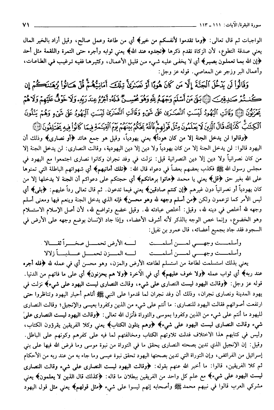 وَقالُوا لَنْ يَدْخُلَ الْجَنَّةَ إِلاَّ مَنْ كانَ هُوداً أَوْ نَصارى تِلْكَ أَمانِيُّهُمْ قُلْ هاتُوا بُرْهانَكُمْ إِنْ كُنْتُمْ صادِقِينَ (111) بَلى مَنْ أَسْلَمَ وَجْهَهُ لِلَّهِ وَهُوَ مُحْسِنٌ فَلَهُ أَجْرُهُ عِنْدَ رَبِّهِ وَلا خَوْفٌ عَلَيْهِمْ وَلا هُمْ يَحْزَنُونَ (112) وَقالَتِ الْيَهُودُ لَيْسَتِ النَّصارى عَلى شَيْءٍ وَقالَتِ النَّصارى لَيْسَتِ الْيَهُودُ عَلى شَيْءٍ وَهُمْ يَتْلُونَ الْكِتابَ كَذلِكَ قالَ الَّذِينَ لا يَعْلَمُونَ مِثْلَ قَوْلِهِمْ فَاللَّهُ يَحْكُمُ بَيْنَهُمْ يَوْمَ الْقِيامَةِ فِيما كانُوا فِيهِ يَخْتَلِفُونَ (113)