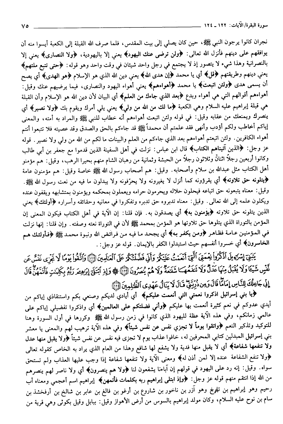 يا بَنِي إِسْرائِيلَ اذْكُرُوا نِعْمَتِيَ الَّتِي أَنْعَمْتُ عَلَيْكُمْ أي أيادي لديكم وصنعي بكم واستنقاذي إياكم من أيدي عدوكم في نعم كثيرة أنعمت بها عليكم وَأَنِّي فَضَّلْتُكُمْ عَلَى الْعالَمِينَ أي واذكروا تفضيلي إياكم على عالمي زمانكم، وفي هذه الآية عظة لليهود الذي كانوا في زمن رسول الله صلّى الله عليه وسلّم وكررها في أول السورة وهنا للتوكيد وتذكير النعم وَاتَّقُوا يَوْماً لا تَجْزِي نَفْسٌ عَنْ نَفْسٍ شَيْئاً وفي هذه الآية ترهيب لهم والمعنى يا معشر بني إسرائيل المبدلين كتابي المحرفين له، خافوا عذاب يوم لا تجزى فيه نفس عن نفس شيئا وَلا يُقْبَلُ مِنْها عَدْلٌ وَلا تَنْفَعُها شَفاعَةٌ أي لا يقبل منها فدية ولا يشفع لها شافع وهذا من العام الذي يراد به الخاص كقوله تعالى وَلا تَنْفَعُ الشَّفاعَةُ عِنْدَهُ إِلَّا لِمَنْ أَذِنَ لَهُ ومعنى الآية ولا تنفعها شفاعة إذا وجب عليها العذاب ولم تستحق سواه. وقيل: إنه رد على اليهود في قولهم إن آباءنا يشفعون لنا وَلا هُمْ يُنْصَرُونَ أي ولا ناصر لهم ينصرهم من الله إذا انتقم منهم قوله عز وجل: وَإِذِ ابْتَلى إِبْراهِيمَ رَبُّهُ بِكَلِماتٍ فَأَتَمَّهُنَّ إبراهيم اسم أعجمي ومعناه أب رحيم وهو إبراهيم بن تارخ وهو آزر بن ناخور بن شاروع بن أرغو بن فالغ بن عابر بن شالخ بن أرفخشذ بن سام بن نوح عليه السلام، وكان مولد إبراهيم بالسوس من أرض الأهواز وقيل: ببابل وقيل بكوثى وهي قرية من