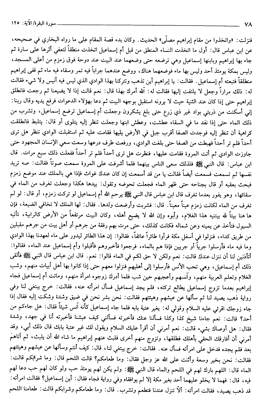 إني أسكنت من ذريتي بواد غير ذي زرع حتى بلغ يشكرون وجعلت أم إسماعيل ترضع إسماعيل، وتشرب من ذلك الماء حتى إذا نفد ما في السقاء عطشت، وعطش ابنها وجعلت تنظر إليه يتلوى أو قال: يتلبط فانطلقت كراهية أن تنظر إليه فوجدت الصفا أقرب جبل في الأرض يليها فقامت عليه ثم استقبلت الوادي تنظر هل ترى أحدا فلم تر أحدا فهبطت من الصفا حتى بلغت الوادي، ورفعت طرف درعها وسعت سعي الإنسان المجهود حتى جاوزت الوادي ثم أتت المروة فقامت عليها، فنظرت هل ترى أحدا فلم تر أحدا ففعلت ذلك سبع مرات. قال ابن عباس: قال النبي صلّى الله عليه وسلّم فلذلك سعى الناس بينهما فلما أشرفت على المروة سمعت صوتا فقالت: صه تريد نفسها ثم تسمعت فسمعت أيضا فقالت يا من قد أسمعت إن كان عندك غواث فإذا هي بالملك عند موضع زمزم فبحث بعقبه أو قال بجناحه حتى ظهر الماء فجعلت تحوضه وتقول: بيدها هكذا وجعلت تغرف من الماء في سقائها، وهو يفور بعد ما تغرف قال ابن عباس قال النبي صلّى الله عليه وسلّم يرحم الله أم إسماعيل لو تركت زمزم، أو قال: لو لم تغرف من الماء لكانت زمزم عينا معينا. قال: فشربت وأرضعت ولدها. فقال: لها الملك لا تخافي الضيعة، فإن هاهنا بيتا لله يبتنيه هذا الغلام، وأبوه وإن الله لا يضيع أهله، وكان البيت مرتفعا من الأرض كالرابية، تأتيه السيول فتأخذ عن يمينه وعن شماله فكانت كذلك، حتى مرت بهم رفقة من جرهم أو أهل بيت من جرهم مقبلين من طريق كداء، فنزلوا في أسفل مكة فرأوا طائرا عائفا، فقالوا: إن هذا الطائر ليدور على ماء لعهدنا بهذا الوادي وما فيه ماء فأرسلوا جريا أو جريين فإذا هم بالماء، فرجعوا فأخبروهم فأقبلوا وأم إسماعيل عند الماء، فقالوا: