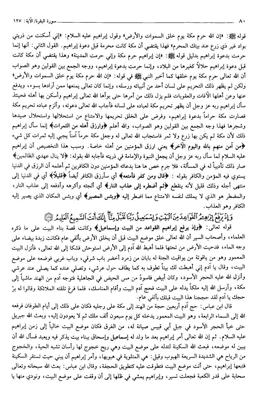 قوله صلّى الله عليه وسلّم: «إن الله حرم مكة يوم خلق السموات والأرض» وقول إبراهيم عليه السلام: «إني أسكنت من ذريتي بواد غير ذي زرع عند بيتك المحرم» فهذا يقتضي أن مكة كانت محرمة قبل دعوة إبراهيم. القول الثاني: أنها إنما حرمت بدعوة إبراهيم بدليل قوله صلّى الله عليه وسلّم: «إن إبراهيم حرم مكة وإني حرمت المدينة» وهذا يقتضي أن مكة كانت قبل دعوة إبراهيم حلالا كغيرها من البلاد، وإنما حرمت بدعوة إبراهيم، ووجه الجمع بين القولين وهو الصواب أن الله تعالى حرم مكة يوم خلقها كما أخبر النبي صلّى الله عليه وسلّم في قوله: «إن الله حرم مكة يوم خلق السموات والأرض» ولكن لم يظهر ذلك التحريم على لسان أحد من أنبيائه ورسله، وإنما كان تعالى يمنعها ممن أرادها بسوء، ويدفع عنها وعن أهلها الآفات والعقوبات فلم يزل ذلك من أمرها حتى بوأها الله تعالى إبراهيم وأسكن بها أهله فحينئذ سأل إبراهيم ربه عز وجل أن يظهر تحريم مكة لعباده على لسانه فأجاب الله تعالى دعوته، وألزم عباده تحريم مكة فصارت مكة حراما بدعوة إبراهيم، وفرض على الخلق تحريمها والامتناع من استحلالها واستحلال صيدها وشجرها فهذا وجه الجمع بين القولين وهو الصواب، والله أعلم وَارْزُقْ أَهْلَهُ مِنَ الثَّمَراتِ إنما سأل إبراهيم ذلك لأن مكة لم يكن بها زرع ولا ثمر فاستجاب الله تعالى له وجعل مكة حرما آمنا يجبي إليه ثمرات كل شيء مَنْ آمَنَ مِنْهُمْ بِاللَّهِ وَالْيَوْمِ الْآخِرِ يعني ارزق المؤمنين من أهله خاصة. وسبب هذا التخصيص أن إبراهيم عليه السلام لما سأل ربه عز وجل أن يجعل النبوة والإمامة في ذريته فأجابه الله بقوله: لا يَنالُ عَهْدِي الظَّالِمِينَ صار ذلك تأديبا له في المسألة، فلا جرم خص هاهنا بدعائه المؤمنين دون الكافرين ثم أعلمه أن الرزق في الدنيا يستوي فيه المؤمن والكافر بقوله: قالَ وَمَنْ كَفَرَ فَأُمَتِّعُهُ أي سأرزق الكافر أيضا قَلِيلًا أي في الدنيا إلى منتهى أجله وذلك قليل لأنه ينقطع ثُمَّ أَضْطَرُّهُ إِلى عَذابِ النَّارِ أي ألجئه وأكرهه وأدفعه إلى عذاب النار، والمضطر هو الذي لا يملك لنفسه الامتناع مما اضطر إليه وَبِئْسَ الْمَصِيرُ أي وبئس المكان الذي يصير إليه الكافر وهو العذاب.