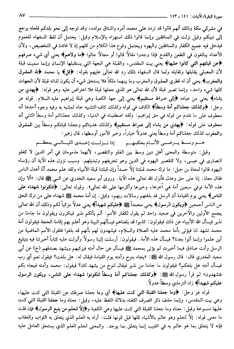 في مشركي مكة وذلك أنهم قالوا قد تردد على محمد أمره واشتاق مولده، وقد توجه إلى نحو بلدكم فلعله يرجع إلى دينكم وقيل نزلت في المنافقين وإنما قالوا ذلك استهزاء بالإسلام وقيل: يحتمل أن لفظ السفهاء للعموم فيدخل فيه جميع الكفار والمنافقين واليهود ويحتمل وقوع هذا الكلام من كلهم إذ لا فائدة في التخصيص، ولأن الأعداء يبالغون في الطعن والقدح فإذا وجدوا مقالا قالوا أو مجالا جالوا ما وَلَّاهُمْ يعني أي شيء صرفهم عَنْ قِبْلَتِهِمُ الَّتِي كانُوا عَلَيْها يعني بيت المقدس، والقبلة هي الجهة التي يستقبلها الإنسان وإنما سميت قبلة لأن المصلي يقابلها وتقابله ولما قال السفهاء ذلك رد الله تعالى عليهم بقوله: قُلْ يا محمد لِلَّهِ الْمَشْرِقُ وَالْمَغْرِبُ يعني أن له قطري المشرق والمغرب وما بينهما ملكا فلا يستحق شيء أن يكون لذاته قبلة لأن الجهات كلها شيء واحد، وإنما تصير قبلة لأن الله تعالى هو الذي جعلها قبلة فلا اعتراض عليه وهو قوله: يَهْدِي مَنْ يَشاءُ يعني من عباده إِلى صِراطٍ مُسْتَقِيمٍ يعني إلى جهة الكعبة وهي قبلة إبراهيم عليه السلام. قوله عز وجل: وَكَذلِكَ جَعَلْناكُمْ أُمَّةً وَسَطاً الكاف في قوله وكذلك كاف التشبيه جاء لمشبه به وفيه وجوه أحدها أنه معطوف على ما تقدم من قوله في حق إبراهيم: ولقد اصطفيناه في الدنيا، وكذلك جعلناكم أمة وسطا الثاني أنه معطوف على قوله: يَهْدِي مَنْ يَشاءُ إِلى صِراطٍ مُسْتَقِيمٍ وكذلك هديناكم وجعلنا قبلتكم وسطا بين المشرق والمغرب كذلك جعلناكم أمة وسطا يعني عدولا خيارا، وخير الأمور أوسطها، قال زهير: