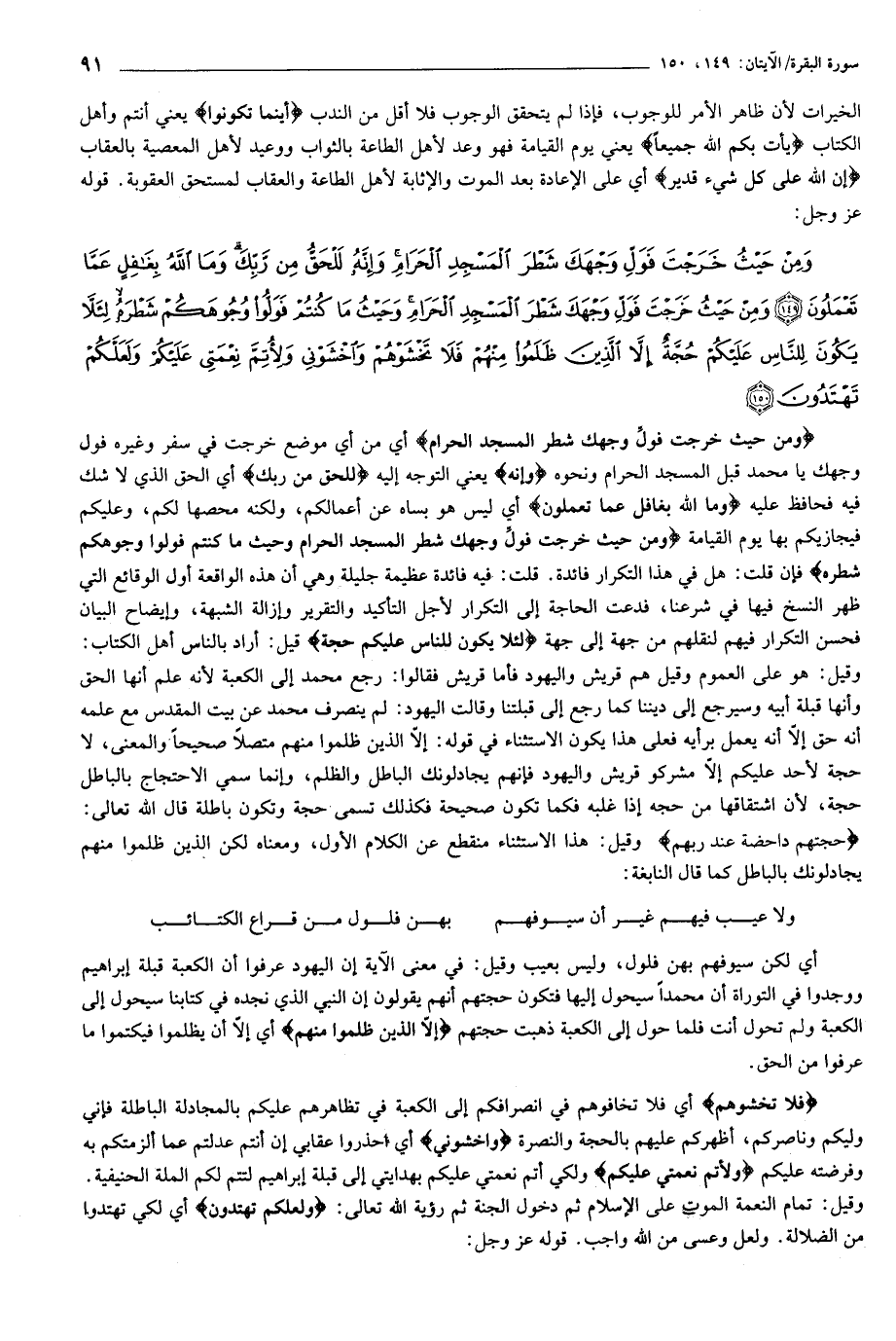 وَمِنْ حَيْثُ خَرَجْتَ فَوَلِّ وَجْهَكَ شَطْرَ الْمَسْجِدِ الْحَرامِ وَإِنَّهُ لَلْحَقُّ مِنْ رَبِّكَ وَمَا اللَّهُ بِغافِلٍ عَمَّا تَعْمَلُونَ (149) وَمِنْ حَيْثُ خَرَجْتَ فَوَلِّ وَجْهَكَ شَطْرَ الْمَسْجِدِ الْحَرامِ وَحَيْثُ ما كُنْتُمْ فَوَلُّوا وُجُوهَكُمْ شَطْرَهُ لِئَلاَّ يَكُونَ لِلنَّاسِ عَلَيْكُمْ حُجَّةٌ إِلاَّ الَّذِينَ ظَلَمُوا مِنْهُمْ فَلا تَخْشَوْهُمْ وَاخْشَوْنِي وَلِأُتِمَّ نِعْمَتِي عَلَيْكُمْ وَلَعَلَّكُمْ تَهْتَدُونَ (150)