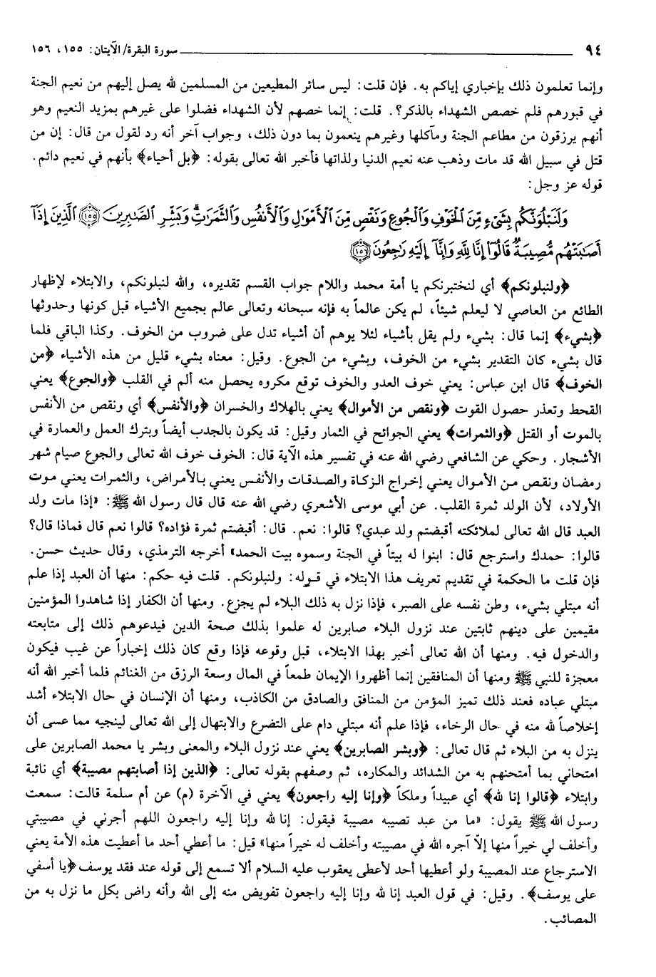 فإن قلت ما الحكمة في تقديم تعريف هذا الابتلاء في قوله: ولنبلونكم. قلت فيه حكم: منها أن العبد إذا علم أنه مبتلي بشيء، وطن نفسه على الصبر، فإذا نزل به ذلك البلاء لم يجزع. ومنها أن الكفار إذا شاهدوا المؤمنين مقيمين على دينهم ثابتين عند نزول البلاء صابرين له علموا بذلك صحة الدين فيدعوهم ذلك إلى متابعته والدخول فيه. ومنها أن الله تعالى أخبر بهذا الابتلاء، قبل وقوعه فإذا وقع كان ذلك إخبارا عن غيب فيكون معجزة للنبي صلّى الله عليه وسلّم ومنها أن المنافقين إنما أظهروا الإيمان طمعا في المال وسعة الرزق من الغنائم فلما أخبر الله أنه مبتلي عباده فعند ذلك تميز المؤمن من المنافق والصادق من الكاذب، ومنها أن الإنسان في حال الابتلاء أشد إخلاصا لله منه في حال الرخاء، فإذا علم أنه مبتلي دام على التضرع والابتهال إلى الله تعالى لينجيه مما عسى أن ينزل به من البلاء ثم قال تعالى: وَبَشِّرِ الصَّابِرِينَ يعني عند نزول البلاء والمعنى وبشر يا محمد الصابرين على امتحاني بما أمتحنهم به من الشدائد والمكاره، ثم وصفهم بقوله تعالى: الَّذِينَ إِذا أَصابَتْهُمْ مُصِيبَةٌ أي نائبة وابتلاء قالُوا إِنَّا لِلَّهِ أي عبيدا وملكا وَإِنَّا إِلَيْهِ راجِعُونَ يعني في الآخرة (م) عن أم سلمة قالت: سمعت رسول الله صلّى الله عليه وسلّم يقول: «ما من عبد تصيبه مصيبة فيقول: إنا لله وإنا إليه راجعون اللهم أجرني في مصيبتي وأخلف لي خيرا منها إلّا آجره الله في مصيبته وأخلف له خيرا منها» قيل: ما أعطي أحد ما أعطيت هذه الأمة يعني الاسترجاع عند المصيبة ولو أعطيها أحد لأعطى يعقوب عليه السلام ألا تسمع إلى قوله عند فقد يوسف يا أَسَفى عَلى يُوسُفَ. وقيل: في قول العبد إنا لله وإنا إليه راجعون تفويض منه إلى الله وأنه راض بكل ما نزل به من المصائب.