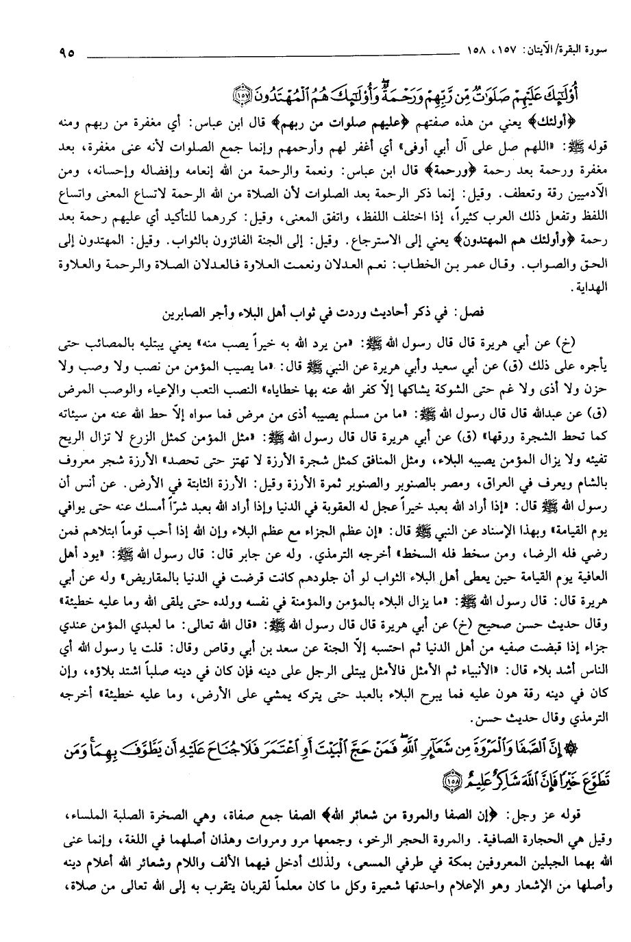 قوله عز وجل: إِنَّ الصَّفا وَالْمَرْوَةَ مِنْ شَعائِرِ اللَّهِ الصفا جمع صفاة، وهي الصخرة الصلبة الملساء، وقيل هي الحجارة الصافية. والمروة الحجر الرخو، وجمعها مرو ومروات وهذان أصلهما في اللغة، وإنما عنى الله بهما الجبلين المعروفين بمكة في طرفي المسعى، ولذلك أدخل فيهما الألف واللام وشعائر الله أعلام دينه وأصلها من الإشعار وهو الإعلام واحدتها شعيرة وكل ما كان معلما لقربان يتقرب به إلى الله تعالى من صلاة،
