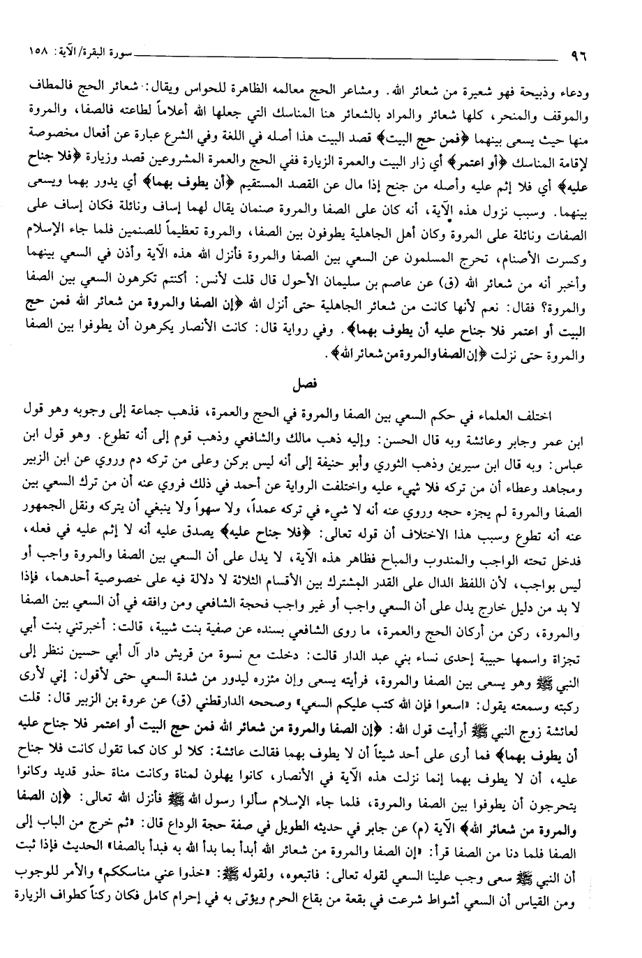 ودعاء وذبيحة فهو شعيرة من شعائر الله. ومشاعر الحج معالمه الظاهرة للحواس ويقال: شعائر الحج فالمطاف والموقف والمنحر، كلها شعائر والمراد بالشعائر هنا المناسك التي جعلها الله أعلاما لطاعته فالصفا، والمروة منها حيث يسعى بينهما فَمَنْ حَجَّ الْبَيْتَ قصد البيت هذا أصله في اللغة وفي الشرع عبارة عن أفعال مخصوصة لإقامة المناسك أَوِ اعْتَمَرَ أي زار البيت والعمرة الزيارة ففي الحج والعمرة المشروعين قصد وزيارة فَلا جُناحَ عَلَيْهِ أي فلا إثم عليه وأصله من جنح إذا مال عن القصد المستقيم أَنْ يَطَّوَّفَ بِهِما أي يدور بهما ويسعى بينهما. وسبب نزول هذه الآية، أنه كان على الصفا والمروة صنمان يقال لهما إساف ونائلة فكان إساف على الصفات ونائلة على المروة وكان أهل الجاهلية يطوفون بين الصفا، والمروة تعظيما للصنمين فلما جاء الإسلام وكسرت الأصنام، تحرج المسلمون عن السعي بين الصفا والمروة فأنزل الله هذه الآية وأذن في السعي بينهما وأخبر أنه من شعائر الله (ق) عن عاصم بن سليمان الأحول قال قلت لأنس: أكنتم تكرهون السعي بين الصفا والمروة؟ فقال: نعم لأنها كانت من شعائر الجاهلية حتى أنزل الله إِنَّ الصَّفا وَالْمَرْوَةَ مِنْ شَعائِرِ اللَّهِ فَمَنْ حَجَّ الْبَيْتَ أَوِ اعْتَمَرَ فَلا جُناحَ عَلَيْهِ أَنْ يَطَّوَّفَ بِهِما. وفي رواية قال: كانت الأنصار يكرهون أن يطوفوا بين الصفا والمروة حتى نزلت إِنَّ الصَّفا وَالْمَرْوَةَ مِنْ شَعائِرِ اللَّهِ.
