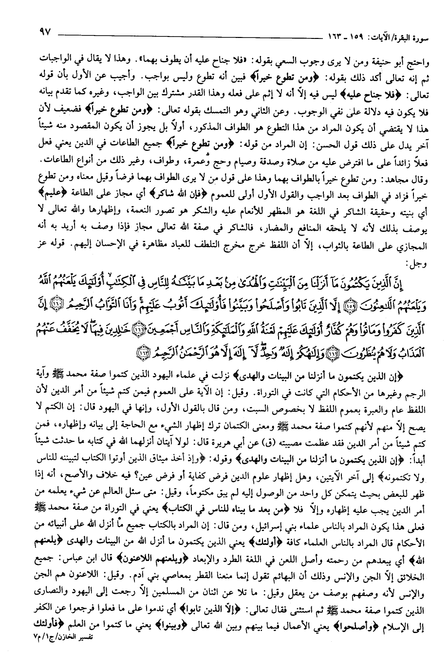 إِنَّ الَّذِينَ يَكْتُمُونَ ما أَنْزَلْنا مِنَ الْبَيِّناتِ وَالْهُدى مِنْ بَعْدِ ما بَيَّنَّاهُ لِلنَّاسِ فِي الْكِتابِ أُولئِكَ يَلْعَنُهُمُ اللَّهُ وَيَلْعَنُهُمُ اللاَّعِنُونَ (159) إِلاَّ الَّذِينَ تابُوا وَأَصْلَحُوا وَبَيَّنُوا فَأُولئِكَ أَتُوبُ عَلَيْهِمْ وَأَنَا التَّوَّابُ الرَّحِيمُ (160) إِنَّ الَّذِينَ كَفَرُوا وَماتُوا وَهُمْ كُفَّارٌ أُولئِكَ عَلَيْهِمْ لَعْنَةُ اللَّهِ وَالْمَلائِكَةِ وَالنَّاسِ أَجْمَعِينَ (161) خالِدِينَ فِيها لا يُخَفَّفُ عَنْهُمُ الْعَذابُ وَلا هُمْ يُنْظَرُونَ (162) وَإِلهُكُمْ إِلهٌ واحِدٌ لا إِلهَ إِلاَّ هُوَ الرَّحْمنُ الرَّحِيمُ (163)