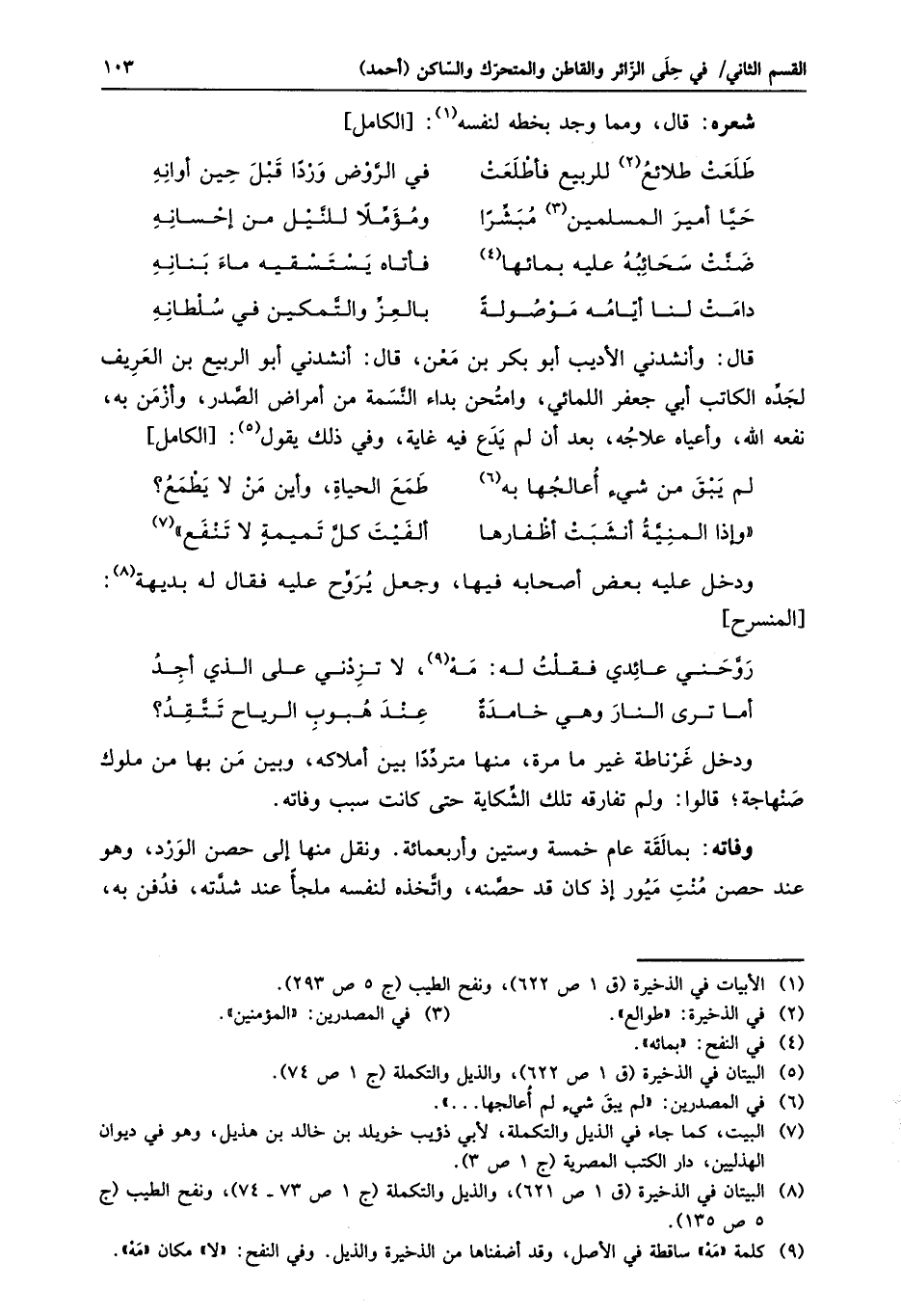 قال: وأنشدني الأديب أبو بكر بن معن، قال: أنشدني أبو الربيع بن العريف لجدّه الكاتب أبي جعفر اللمائي، وامتحن بداء النّسمة من أمراض الصّدر، وأزمن به، نفعه الله، وأعياه علاجه، بعد أن لم يدع فيه غاية، وفي ذلك يقول «5» : [الكامل]