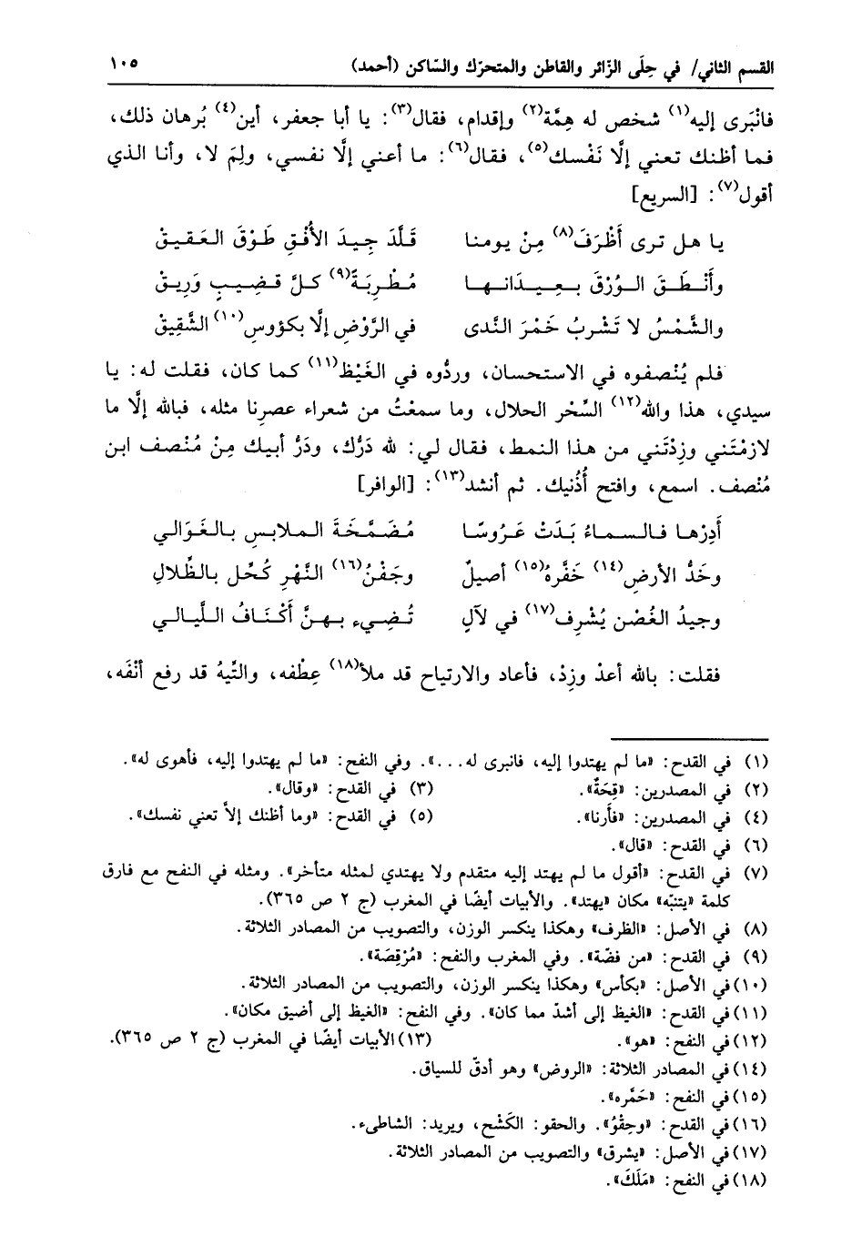 فقلت: بالله أعد وزد، فأعاد والارتياح قد ملأ «18» عطفه، والتّيه قد رفع أنفه،