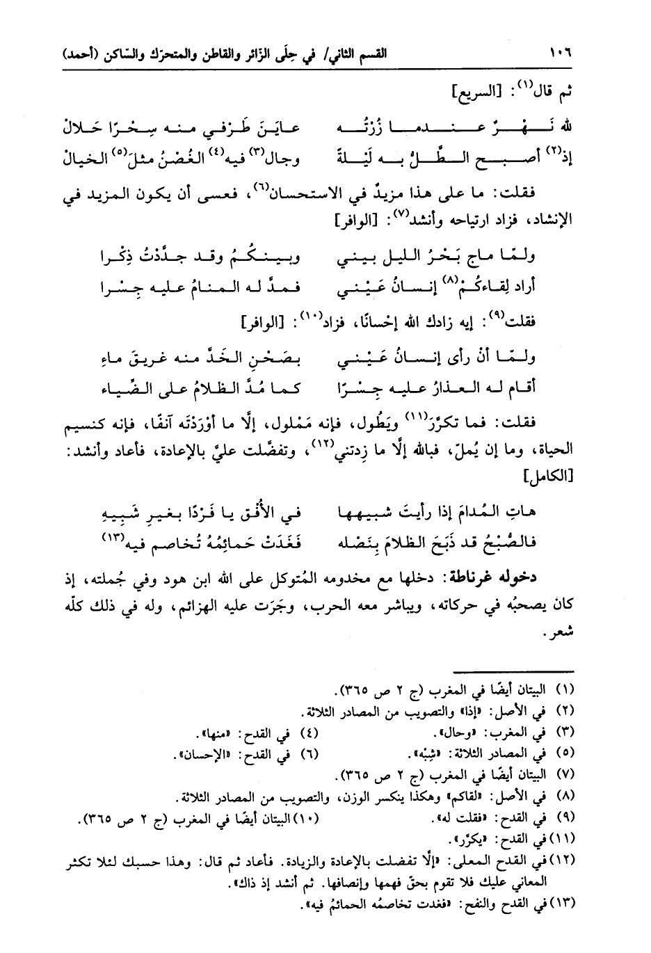 فقلت: فما تكرّر «11» ويطول، فإنه مملول، إلّا ما أوردته آنفا، فإنه كنسيم الحياة، وما إن يملّ، فبالله إلّا ما زدتني «12» ، وتفضّلت عليّ بالإعادة، فأعاد وأنشد: