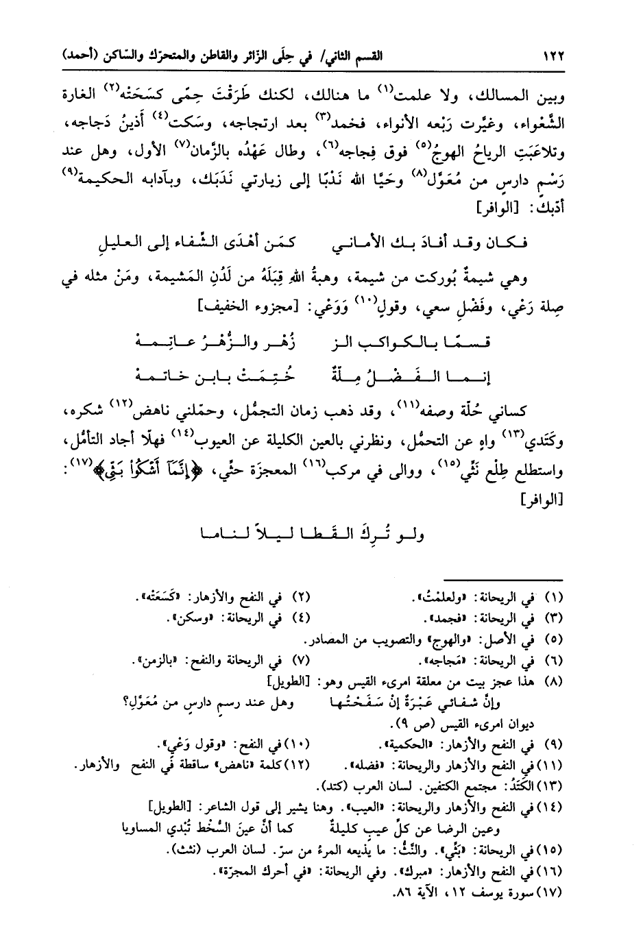 وبين المسالك، ولا علمت «1» ما هنا لك، لكنك طرقت حمى كسحته «2» الغارة الشّعواء، وغيّرت ربعه الأنواء، فخمد «3» بعد ارتجاجه، وسكت «4» أذين دجاجه، وتلاعبت الرياح الهوج «5» فوق فجاجه «6» ، وطال عهده بالزّمان «7» الأول، وهل عند رسم دارس من معوّل «8» وحيّا الله ندبا إلى زيارتي ندبك، وبآدابه الحكيمة «9» أدّبك: [الوافر]