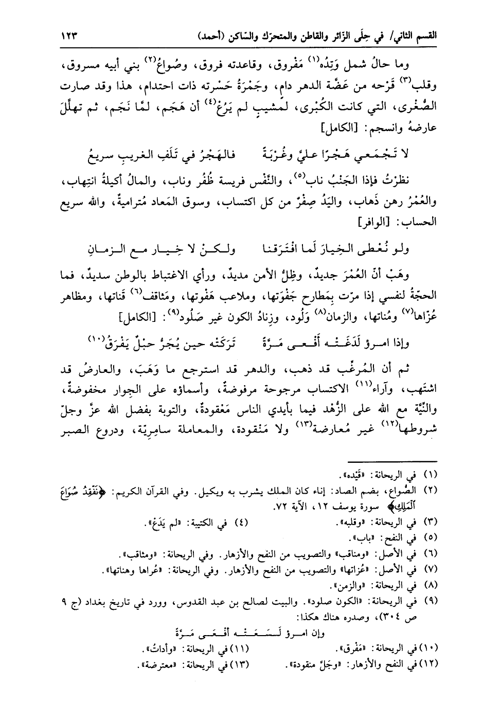 وهب أنّ العمر جديد، وظلّ الأمن مديد، ورأي الاغتباط بالوطن سديد، فما الحجّة لنفسي إذا مرّت بمطارح جفوتها، وملاعب هفوتها، ومثاقف «6» قناتها، ومظاهر عزّاها «7» ومناتها، والزمان «8» ولود، وزناد الكون غير صلود «9» : [الكامل]