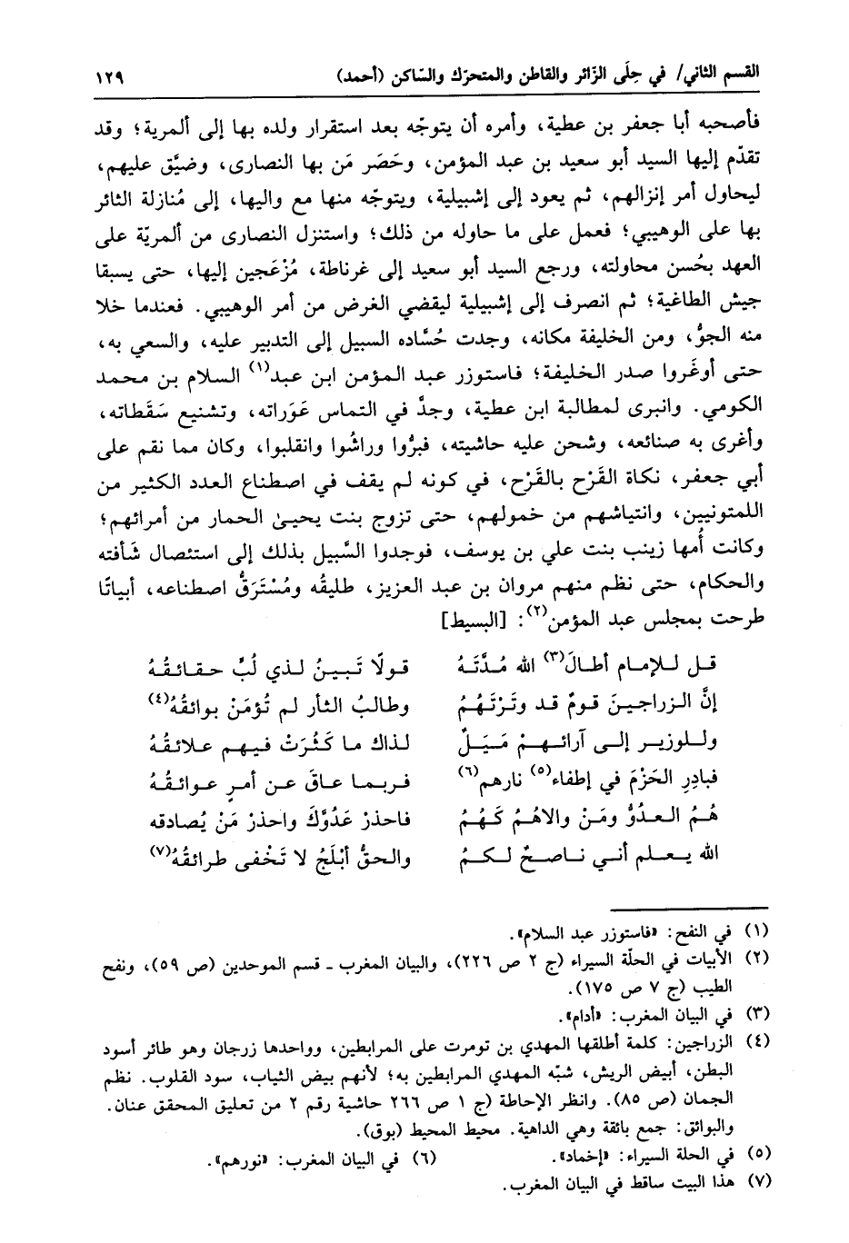 فأصحبه أبا جعفر بن عطية، وأمره أن يتوجّه بعد استقرار ولده بها إلى ألمرية؛ وقد تقدّم إليها السيد أبو سعيد بن عبد المؤمن، وحصر من بها النصارى، وضيّق عليهم، ليحاول أمر إنزالهم، ثم يعود إلى إشبيلية، ويتوجّه منها مع واليها، إلى منازلة الثائر بها على الوهيبي؛ فعمل على ما حاوله من ذلك؛ واستنزل النصارى من ألمريّة على العهد بحسن محاولته، ورجع السيد أبو سعيد إلى غرناطة، مزعجين إليها، حتى يسبقا جيش الطاغية؛ ثم انصرف إلى إشبيلية ليقضي الغرض من أمر الوهيبي. فعندما خلا منه الجوّ، ومن الخليفة مكانه، وجدت حسّاده السبيل إلى التدبير عليه، والسعي به، حتى أو غروا صدر الخليفة؛ فاستوزر عبد المؤمن ابن عبد «1» السلام بن محمد الكومي. وانبرى لمطالبة ابن عطية، وجدّ في التماس عوراته، وتشنيع سقطاته، وأغرى به صنائعه، وشحن عليه حاشيته، فبرّوا وراشوا وانقلبوا، وكان مما نقم على أبي جعفر، نكاة القرح بالقرح، في كونه لم يقف في اصطناع العدد الكثير من اللمتونيين، وانتياشهم من خمولهم، حتى تزوج بنت يحيى الحمار من أمرائهم؛ وكانت أمها زينب بنت علي بن يوسف، فوجدوا السّبيل بذلك إلى استئصال شأفته والحكام، حتى نظم منهم مروان بن عبد العزيز، طليقه ومسترقّ اصطناعه، أبياتا طرحت بمجلس عبد المؤمن «2» : [البسيط]